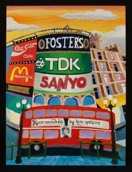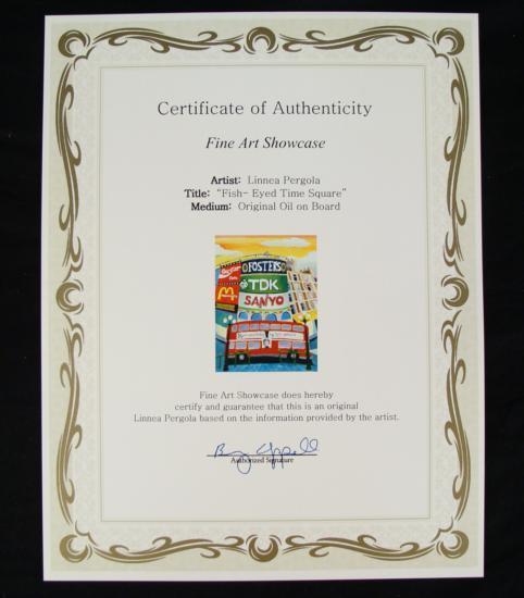 This is an original painting by Linnea Pergola of Times Square in New York City. The perspective here is rather unusual--it's as if you're seeing things from a fish eye lens. The scene has a rounded look, and it's full of bright colors, just like you'd expect at this exciting spot in the city. Artist: Linnea Pergola Title: "Fish Eyed Times Square" Medium: Original painting on board Signed: In paint, lower right Size: 18" x 24" Condition: Excellent This is a unique view of Times Square, done with a playful tone that Pergola is so loved for. Biography:Linnea Pergola (1953-_) was born in Los Angeles, and developed an interest in travel. She joined the Peace Corps out of college, and was stationed in Southeast Asia. Her further explorations of foreign lands led her to Europe, Russia, and to the East Coast of the United States. This wanderlust became the inspiration for her art. She draws and paints various locales with an imaginative flair. Her art is well loved for its naive charm and originality.