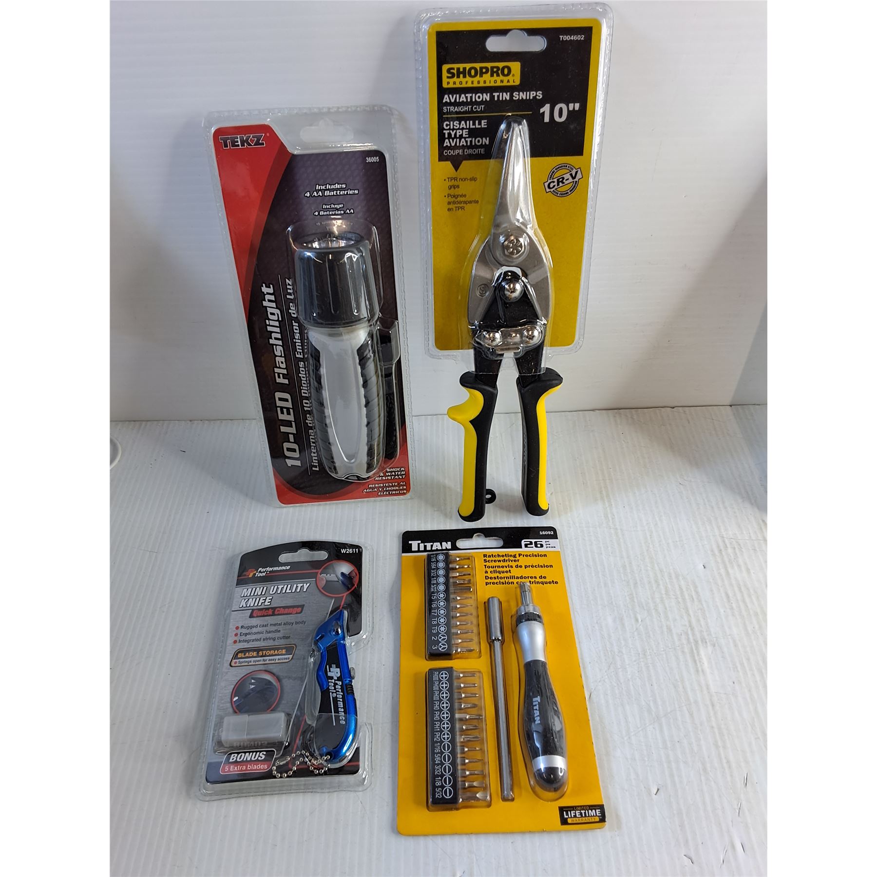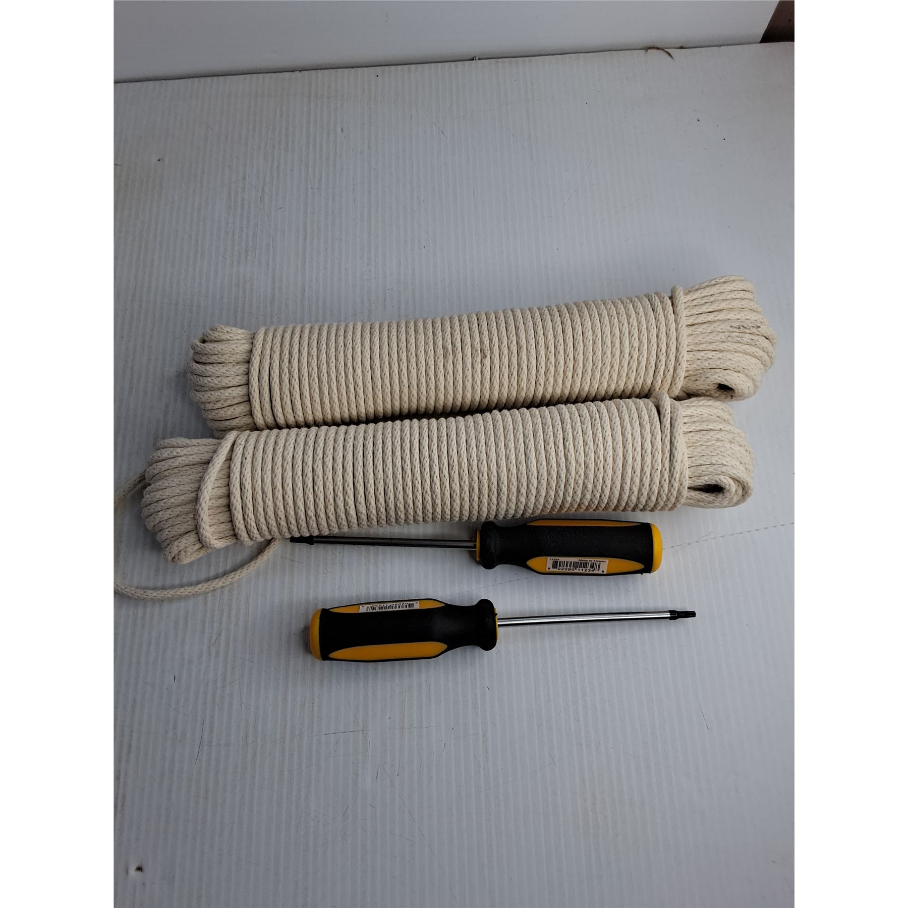 Linoleum Knife,Tin Snips,Hose Clamp Pliers,Flashlight,(2) Rolls of Rope and more as pictured