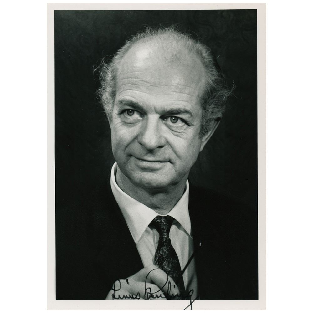 Glossy 5 x 7 head-and-shoulders photo of Pauling in a suit and tie, signed at the bottom in black ink. In very fine condition.