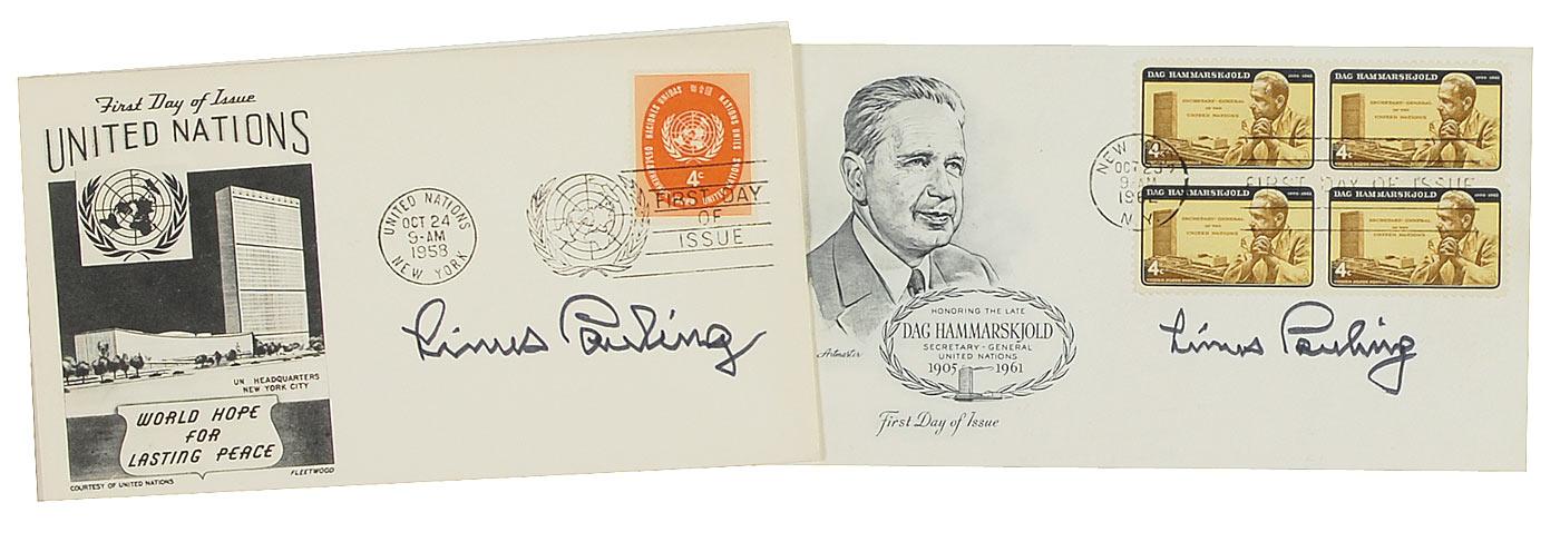 American chemist (1901–1994) who holds the unique distinction of winning Nobel Prizes in both the Chemistry (1954) and Peace (1962) categories. Two different FDCs, with cachets honoring the United Nations and Dag Hammarskjold respectively, each signed in black felt tip by Pauling. In fine condition, with staining to reverse of one FDC.