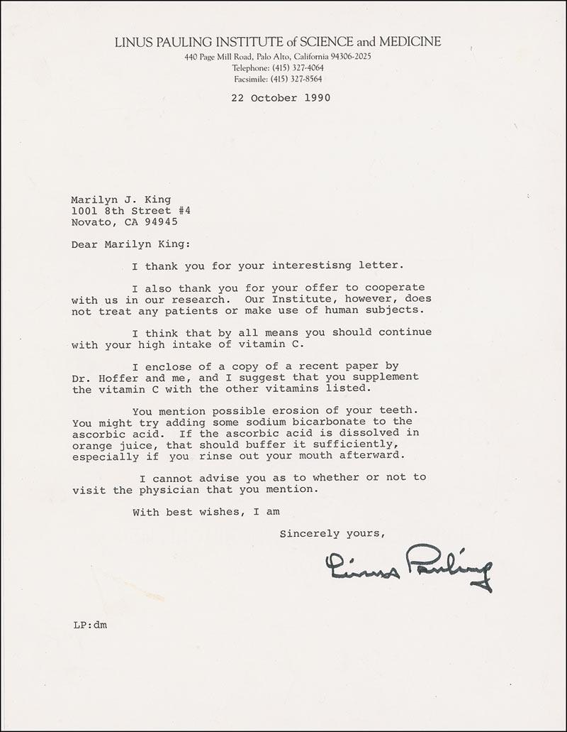 TLS, one page, 8.5 x 11, Linus Pauling Institute of Science and Medicine letterhead, October 22, 1990. Letter to a woman offering to be a research subject and seeking medial advice. In part: “I also thank you for your offer to cooperate with us in our research. Our Institute, however, does not treat any patients or make use of human subjects…I cannot advise you as to whether or not to visit the physician that you mention.” In fine condition, with a couple spots of trivial toning.
