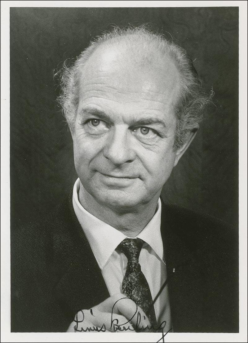 American chemist (1901–1994) who holds the unique distinction of winning Nobel Prizes in both the Chemistry (1954) and Peace (1962) categories. Heavyweight 5 x 7 paperstock photo, signed in black ink. In fine condition.
