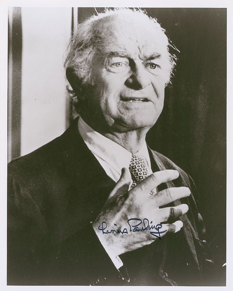 American chemist (1901–1994) who holds the unique distinction of winning Nobel Prizes in both the Chemistry (1954) and Peace (1962) categories. Glossy 8 x 10 photo of Pauling speaking, signed in black felt tip. In fine condition.