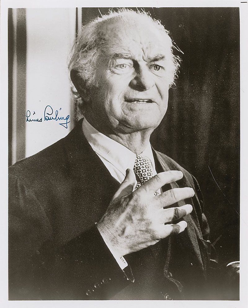 Glossy 8 x 10 photo of Pauling speaking, signed in blue ink. In fine condition, with a light surface scratch to the lower border.