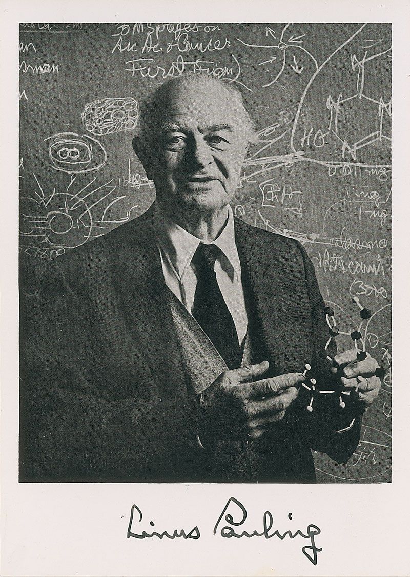 Intelligent 5 x 7 cardstock photo of Pauling holding a molecular model, signed in the lower border in black felt tip. In fine condition.