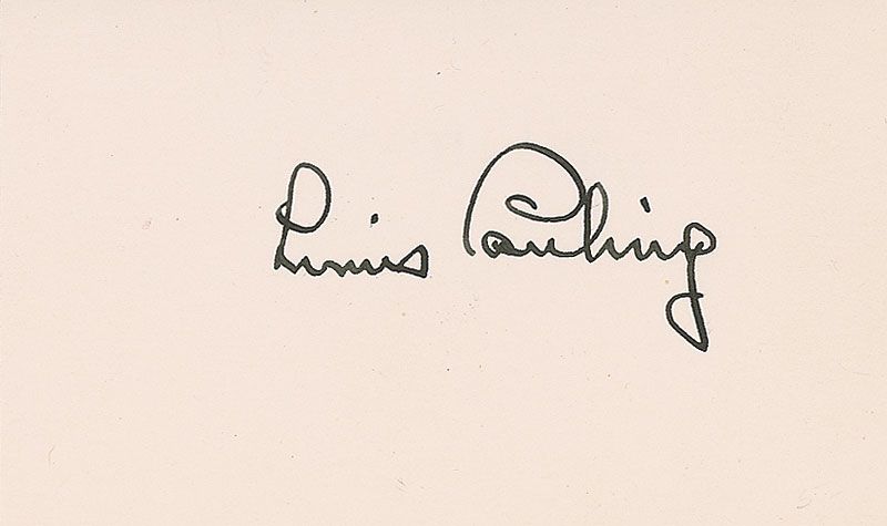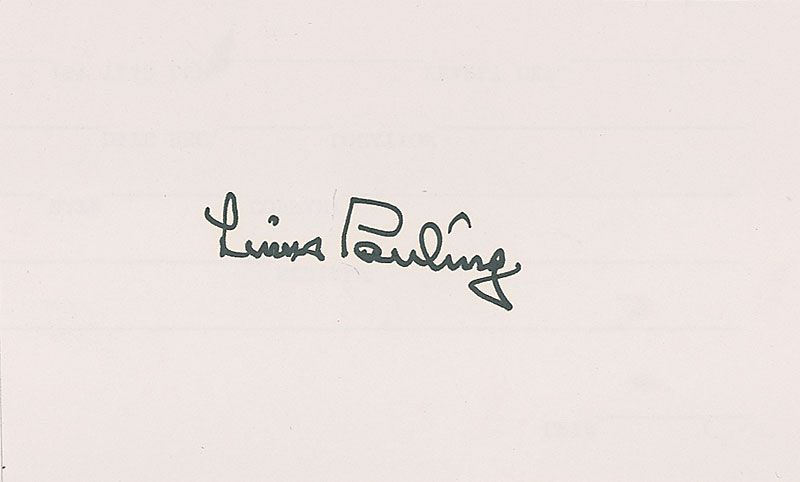 Three items: glossy 5 x 7 photo of Pauling wearing a hat and smiling, signed in blue felt tip; and two felt tip signatures, “Linus Pauling,” on individual off-white cards. In overall fine condition.