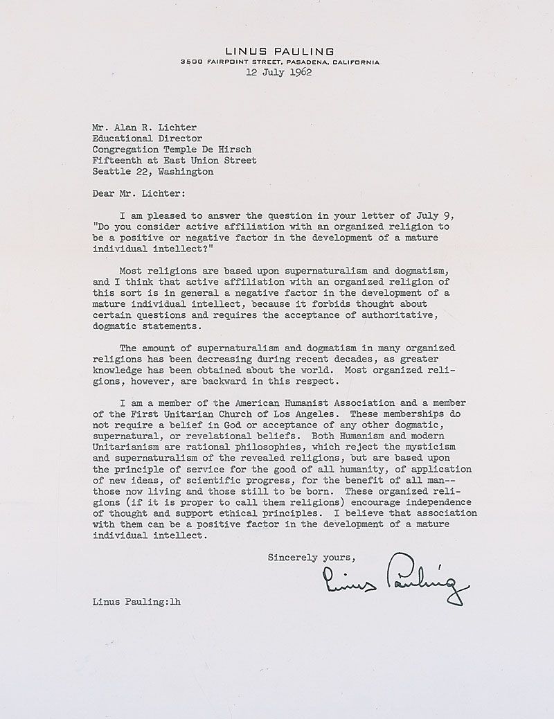 TLS, one page, 8.5 x 11, personal letterhead, July 12, 1962. Letter to Mr. Alan R. Lichter answering the recipient’s question, “Do you consider active affiliation with an organized religion to be a positive or negative factor in the development of a mature individual intellect?” In part: “Most religions are based upon supernaturalism and dogmatism, and I think that active affiliation with an organized religion of this sort is in general a negative factor…because it forbids thought about certain questions and requires the acceptance of authoritative, dogmatic statements….Most organized religions…are backward in this respect. I am a member of the American Humanist Association and a member of the First Unitarian Church of Los Angeles. These memberships do not require a belief in God or acceptance of any other dogmatic, supernatural, or revelational beliefs. Both…are rational philosophies, which reject the mysticism and supernaturalism of the revealed religions, but are based upon the principle of service for the good of all humanity, of application of new ideas, of scientific progress, for the benefit of all man—those now living and those still to be born. These organized religions (if it is proper to call them religions) encourage independence of thought and support ethical principles. I believe that association with them can be a positive factor in the development of a mature individual intellect.” In fine condition.