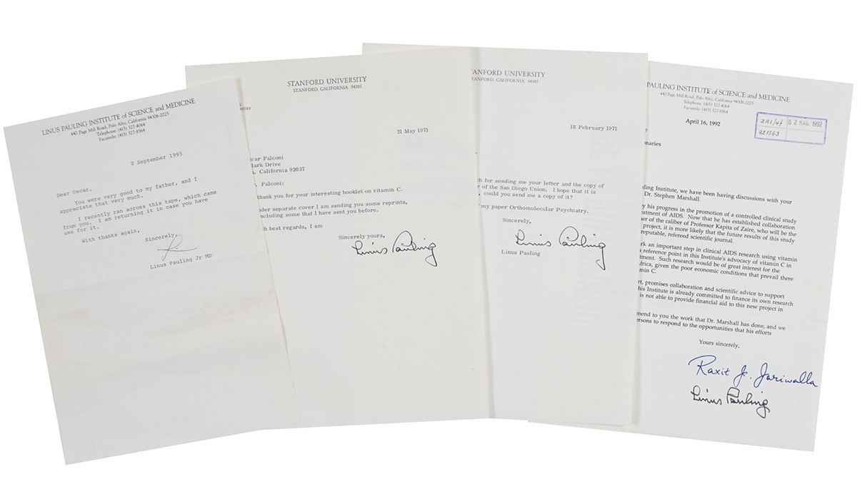 Collection of nine items, including three TLSs from Pauling, including two to Oscar Falconi, both dated from 1971. One letter reads, “I thank you for your interesting booklet on Vitamin C.” The third TLS is signed by Pauling and Raxit J. Jariwalla, sent to Father Henri Barlage, and dated April 16, 1992. Letter reads, in part: “We are very pleased by his progress in the promotion of a controlled clinical study of vitamin C in the treatment of AIDS…it is more likely that the future results of this study will be published in a reputable, refereed scientific journal. This in turn would mark an important step in clinical AIDS research using vitamin C and would serve as a reference point in this Institute's advocacy of vitamin C in AIDS research and treatment. Such research would be of great interest for the treatment of AIDS in Africa…This Institute, for its part, promises collaboration and scientific advice to support this project in Zaire.” Also included are two birthday programs; two printed articles; a short TLS signed by Linus Pauling, Jr.; and a program from Pauling’s memorial service. In overall fine condition.