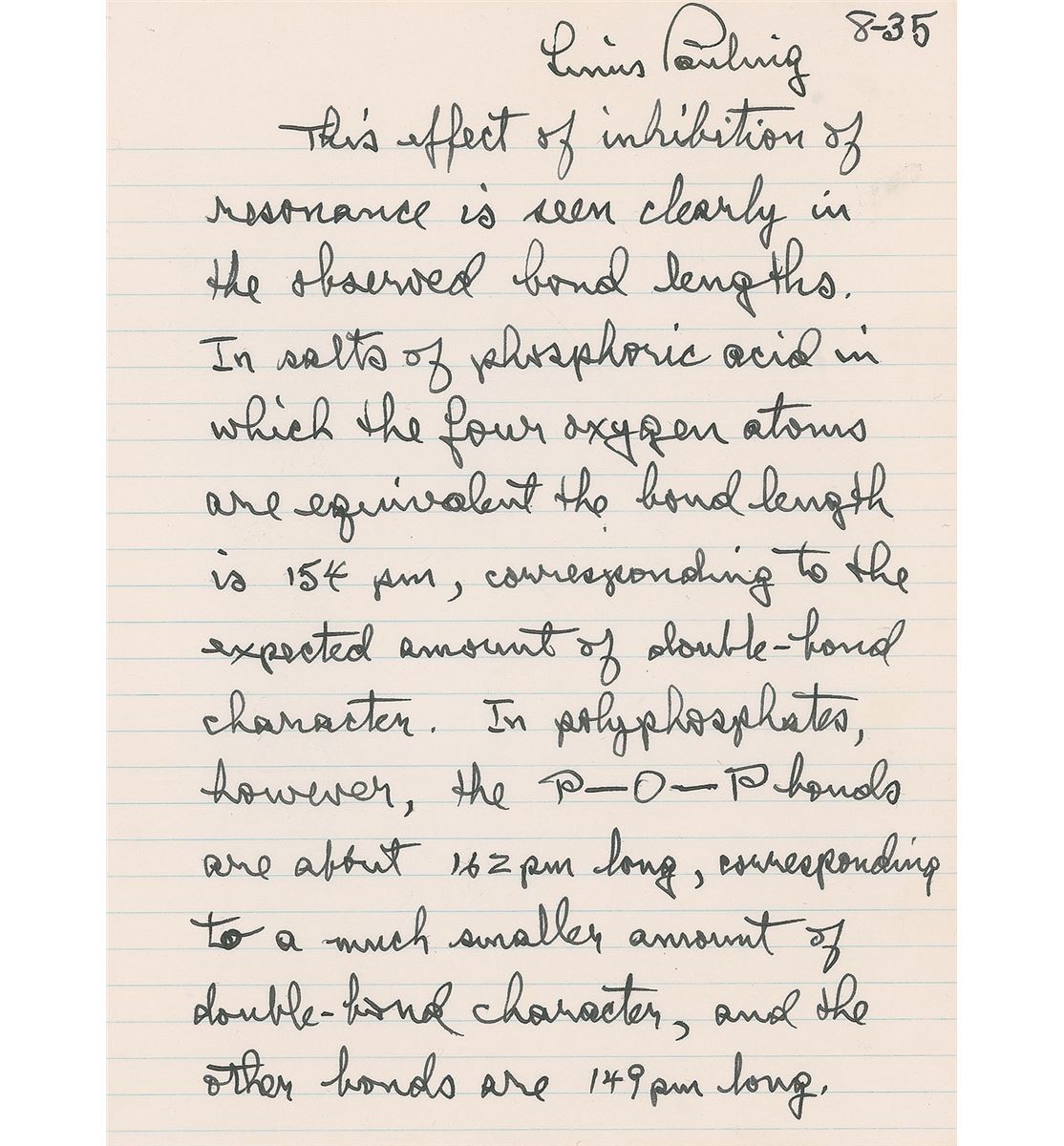 Uncommon AMS, signed at the top, “Linus Pauling,” one page, 8 x 11, no date. An intriguing page of a scientific manuscript. In full: “This effect of inhibition of resonance is seen clearly in the observed bond lengths. In salts of phosphoric acid in which the four oxygen atoms are equivalent the bond length is 154 pm, corresponding to the expected amount of the double-bond character. In polyphosphates, however, the P-O-P bonds are about 162 pm long, corresponding to a much smaller amount of double-bond character, and the other bonds are 149 pm long.” In fine condition.