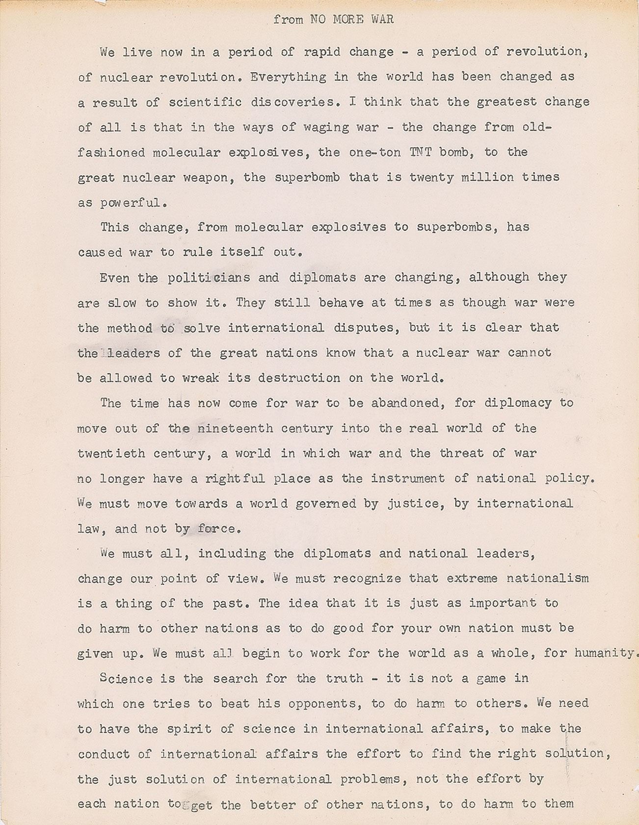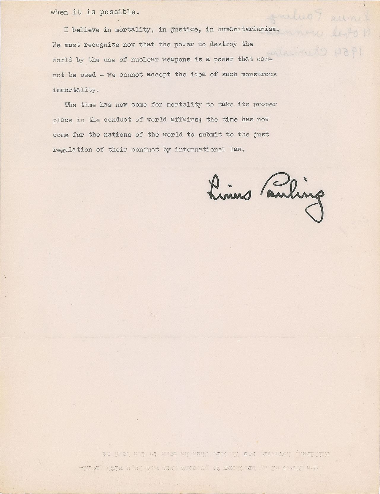 Souvenir typescript containing a section of Linus Pauling's 1958 publication No More War!, two pages, 8.5 x 11, signed boldly at the conclusion in black ink. The typescript, in part: "The greatest change of all is that in the ways of waging war—the change from old-fashioned molecular explosives, the one-ton TNT bomb, to the great nuclear weapon, the superbomb that is twenty million times as powerful…The time has now come for war to be abandoned, for diplomacy to move out of the nineteenth century into the real world of the twentieth century, a world in which was and the threat of war no longer have a rightful place as the instrument of national policy." In fine condition.