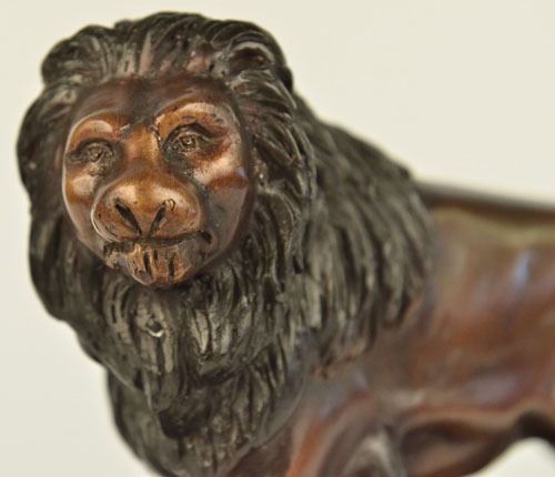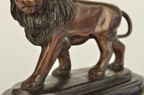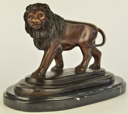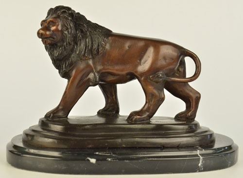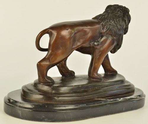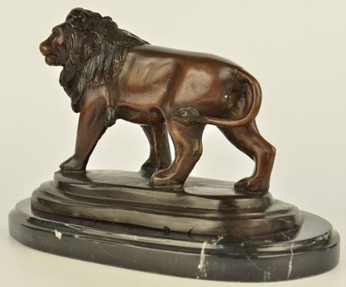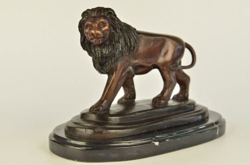 This Is A Sculpture Of The King Of The Animal Kingdom, The Lion. He Is Powerful, Strong And Fierce But Also Passionate Towards His Mate And Cubs. He Walks Through His Domain, Standing Proud And Creating Dust Which Each Mighty Paw That He Puts Down. His Face Resembles The Feeling Of Contentment, His Eyes Piercing As He Wanders With A Wide Stride. His Mane Is Thick, Pronounced With Each Stroke Of The Artist’S Tools Distinguishable From The Next. His Body Is Smooth With A Muscular Tone That Shows He May Be An Older Member Of His Pride. 100% bronze sculpture, this brown patina sculpture was cast using the "lost wax method" and mounted on a black marble base. This sculpture is very interesting a bronze recast based on the original piece. a decorative brown patina bronze sculpture size: 8X12 inches.