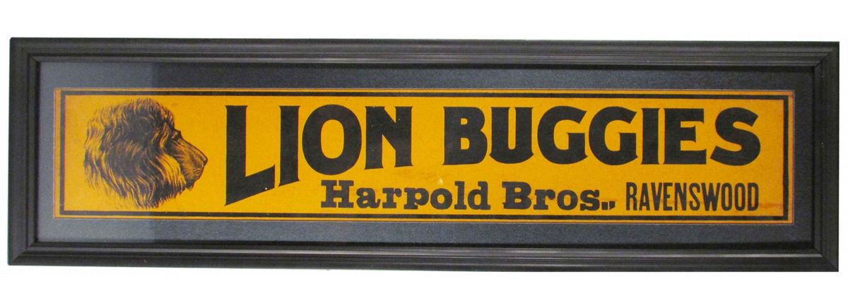 Lion Buggies Paper Sign. Ravenswood. Framed under glass. Slight stain in center otherwise very good condition. 35 1/2 X 6 1/2 inches.