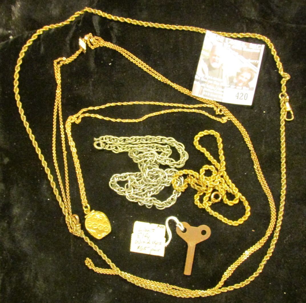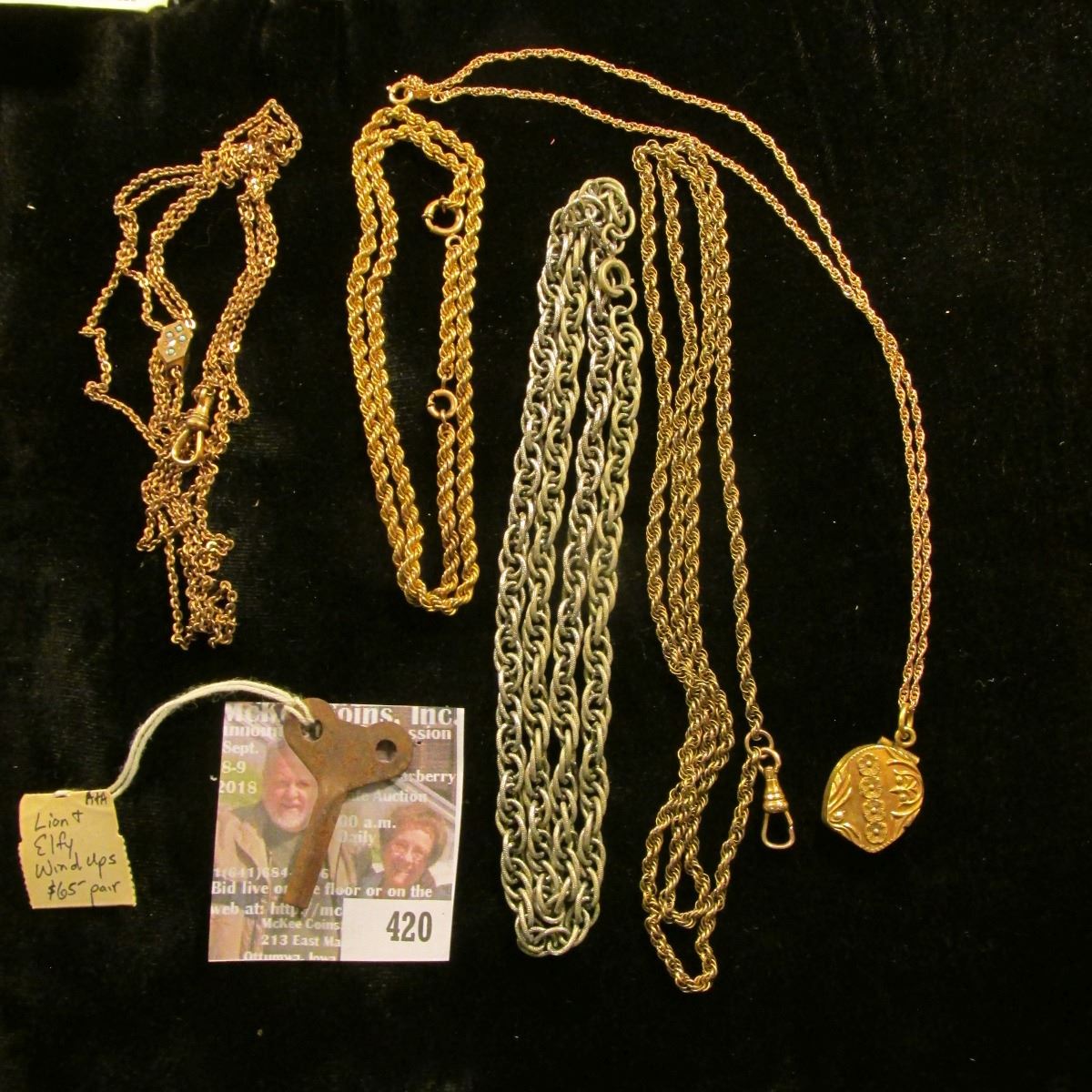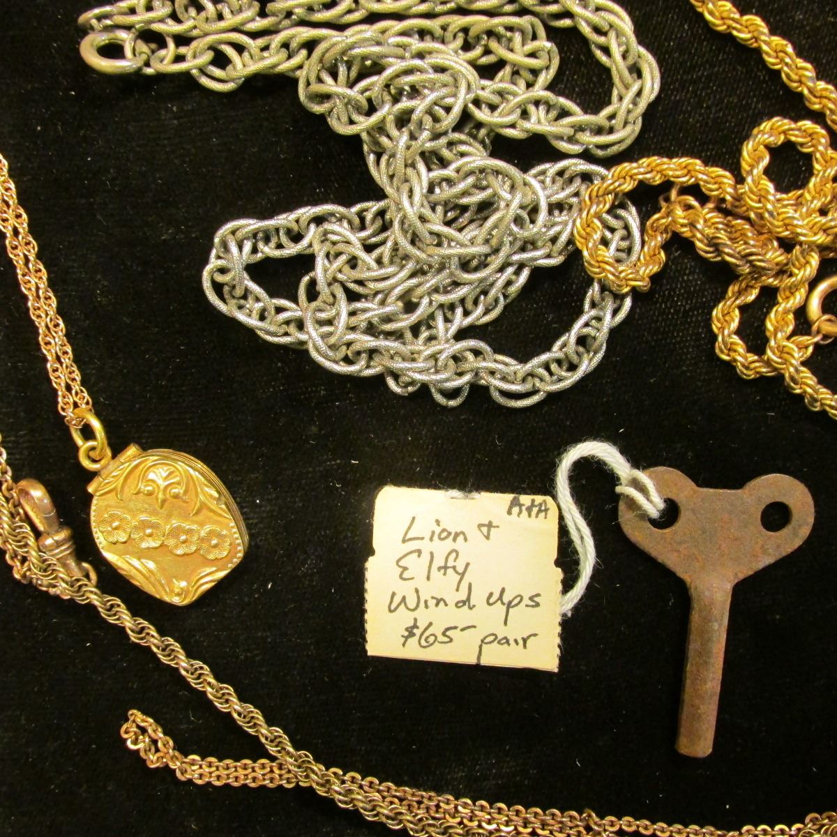 Lion & Elfy Wind ups Key; 1/2c 12K Gold Chain with Gold-filled Locket; braided Gold-filled Chain; silver-colored link chain; braided gold? Watch Chain; & Ladies Slide with opal insets on long ladies Watch Chain.