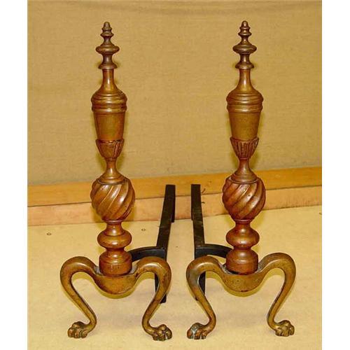 Nice pair of 19th century bronze with a robust copper patina, fireplace andirons signed Scott 104 on the log rungs, urn finial tops, with a bulbous spiral center tapering to a pair of finely cabriole curved legs accented with lions paw feet, measuring 18 inches high by 17 inches long and would make a super addition to any fine household. ****NOTE: Email for larger images.