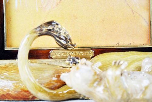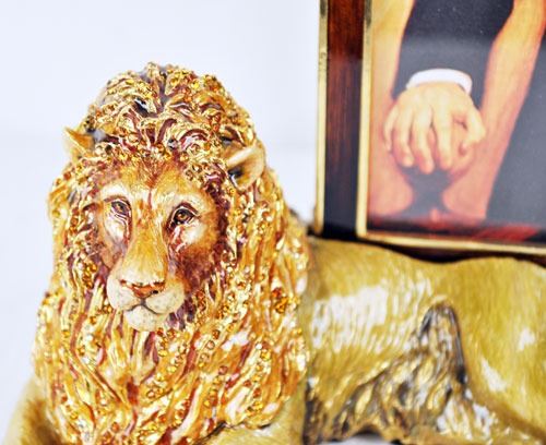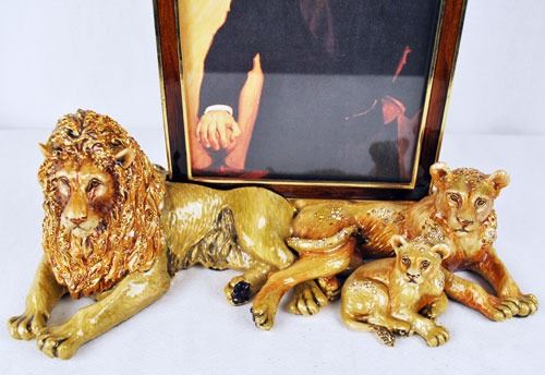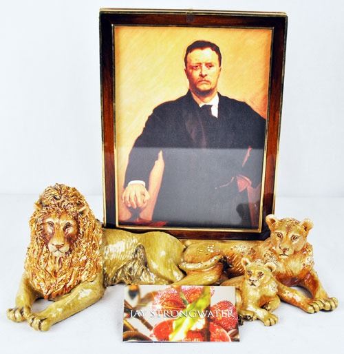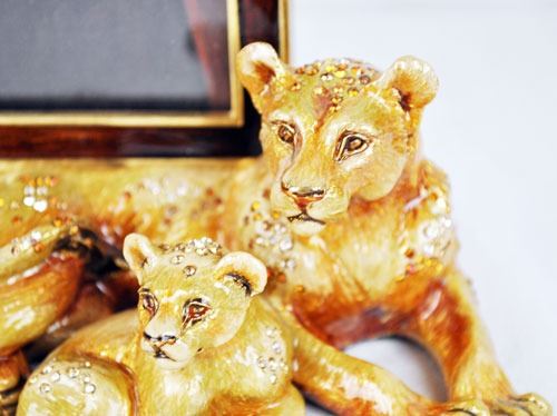 Original lion family father mother and baby jungle jay strong water picture frame come with original box and certificate of authenticity. Highly collectible magnificent limited edition strong water with Swarovski crystals. This is a heavy item. Size: 9X7X10 inches.