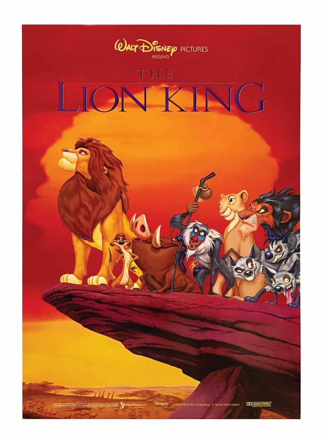 (Disney, 1994) An international 1-sheet poster for the modern animated classic, The Lion King. Printed domestically for distribution outside the United States, the full-bleed poster depicts the adult Simba and cast on Pride Rock. Rolled and never folded, the piece measures 40"x27" and is in very good condition with a diagonal 2.25" stress line at upper right, edge wear, and some edge creasing at lower left.