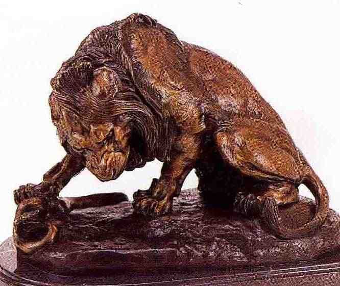 "Lion With Snake" Bronze Sculpture - After Bayre- Museum Brown Finish - Mounted On A Fine Italian Marble Base - Beautifully Detailed - Signed - Mint Condition - 16"H X 20"W - Lost Wax Cast Bronze