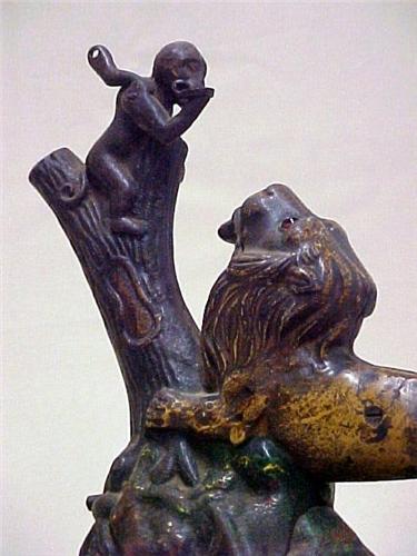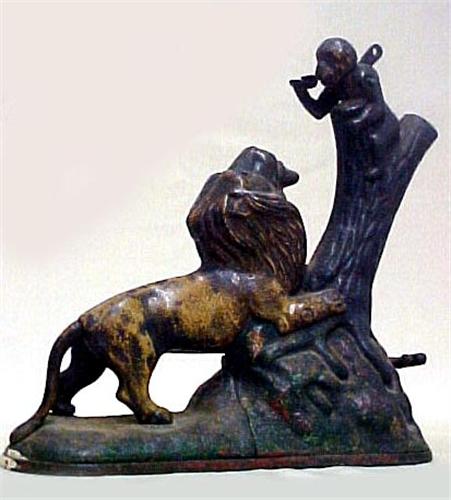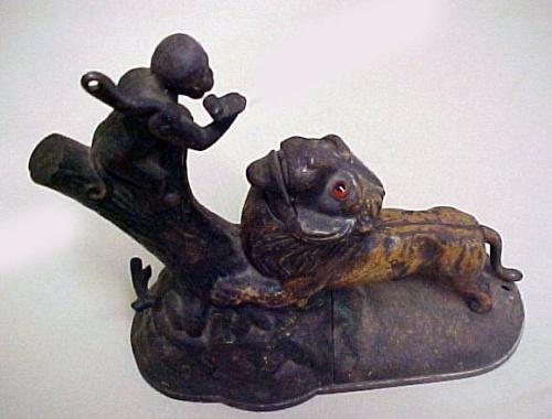 Lion and Monkey cast iron bank; 9" across x 9 1/2" high; working condition; second monkey and one lion's eye missing; paint wear and loss throughout; bottom door missing.