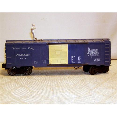 This postwar Lionel 0 gauge #3424 operational brakeman car has an interesting passenger. The brakeman is on top of this blue car, doing whatever it is that brakemen do, and he can appear and disappear at the flip of a lever. There is no damage to this car. This dealer has a large collection of model trains, mostly Lionel with some American Flyer. We invite you to visit our GoAntiques site to view the other selections from this wonderful collection.