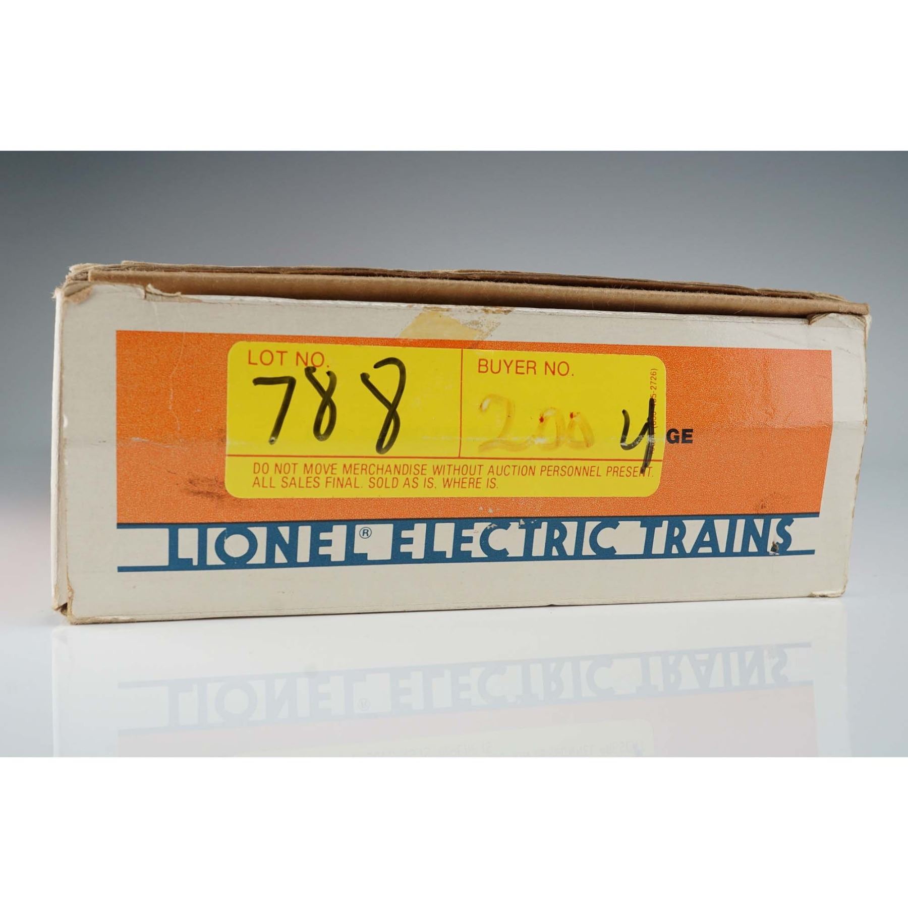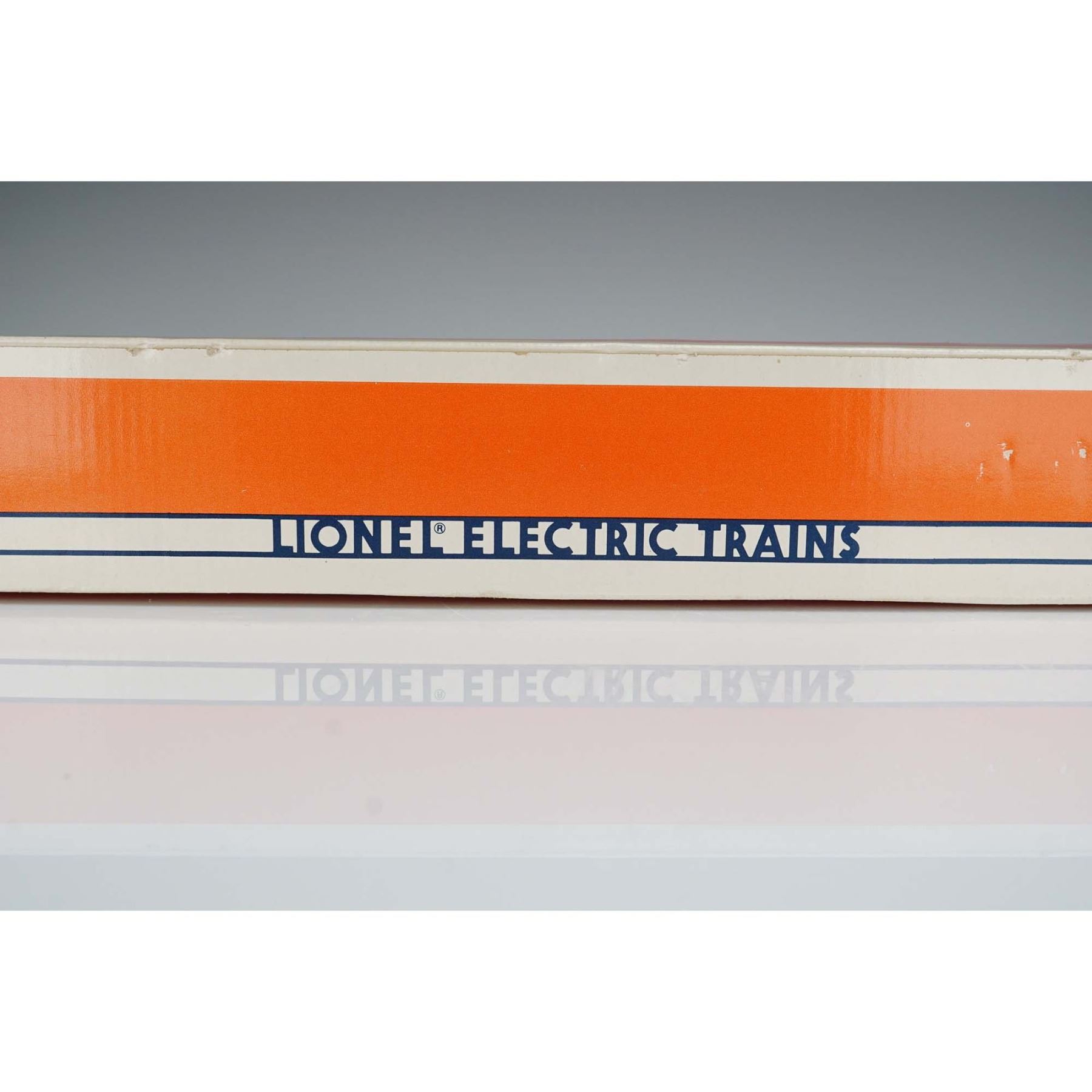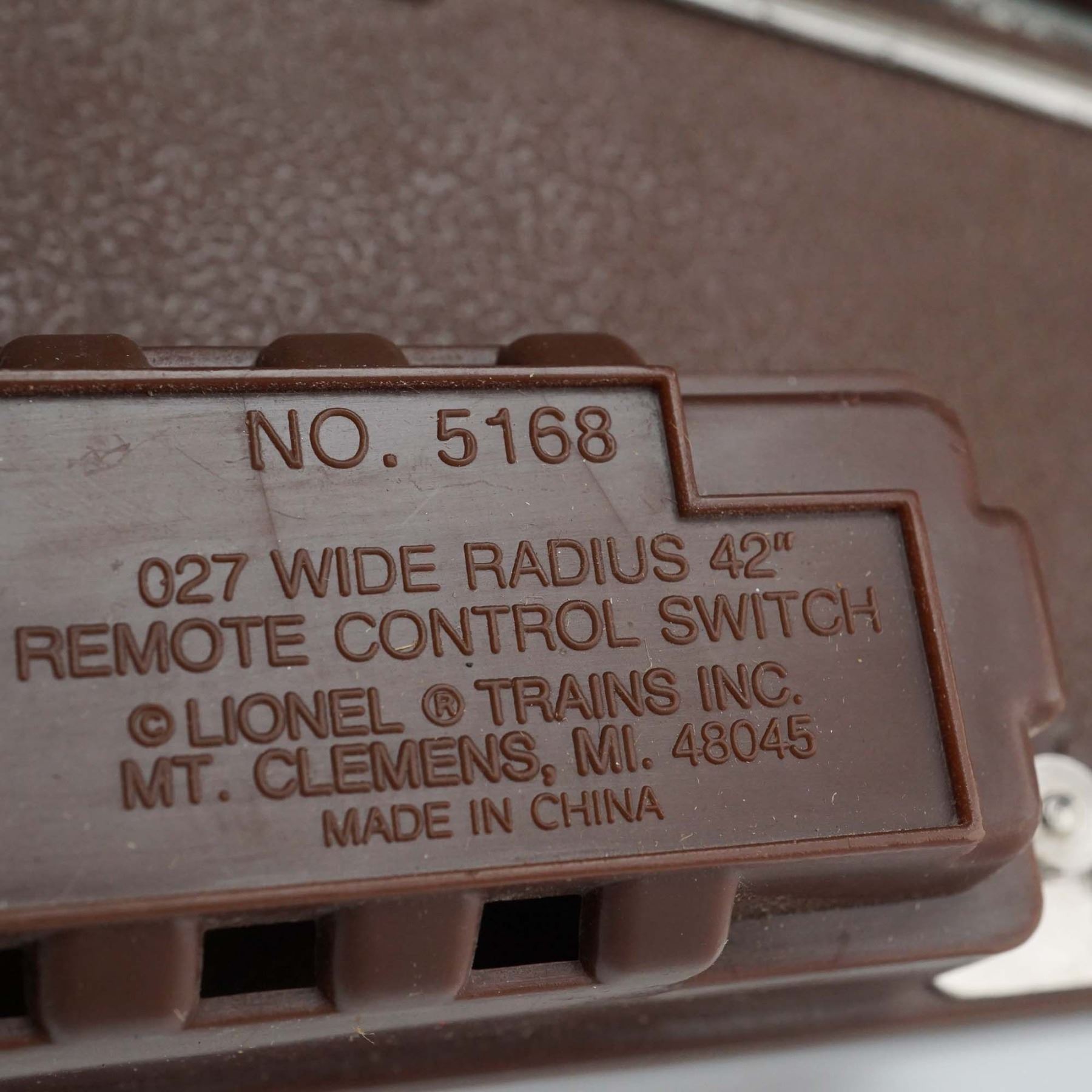A Lionel Electric Trains No. 5168 remote control switch for 027 gauge layouts, designed for wide-radius 42" curves. This right-hand switch includes integrated remote control capability, allowing operators to manage rail traffic with ease and precision. Marked "Made in China" and featuring Lionel's traditional orange and blue packaging, this unit is ideal for collectors or layout builders seeking authenticity and functionality. The switch itself is approximately 16.5"W and comes housed in a box measuring 6.5"L x 16.5"W.