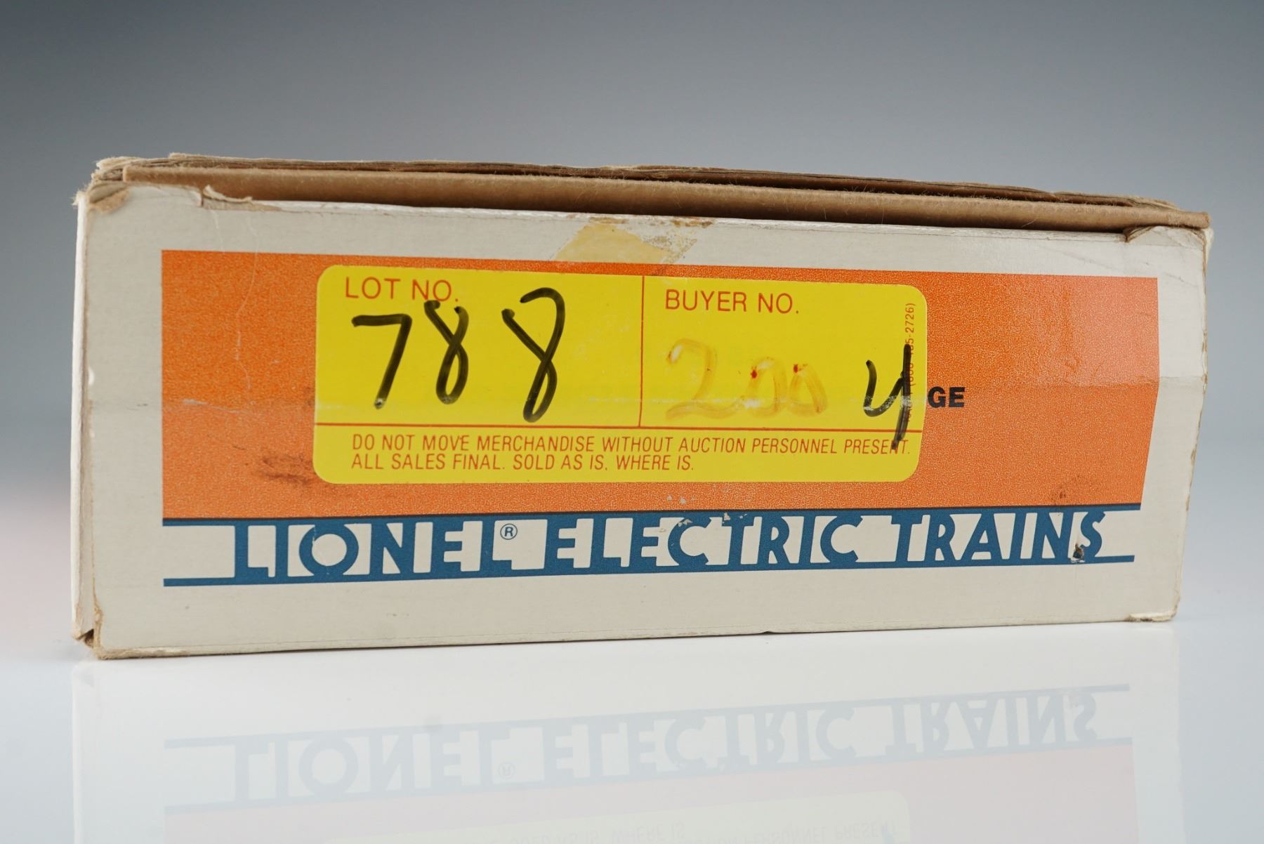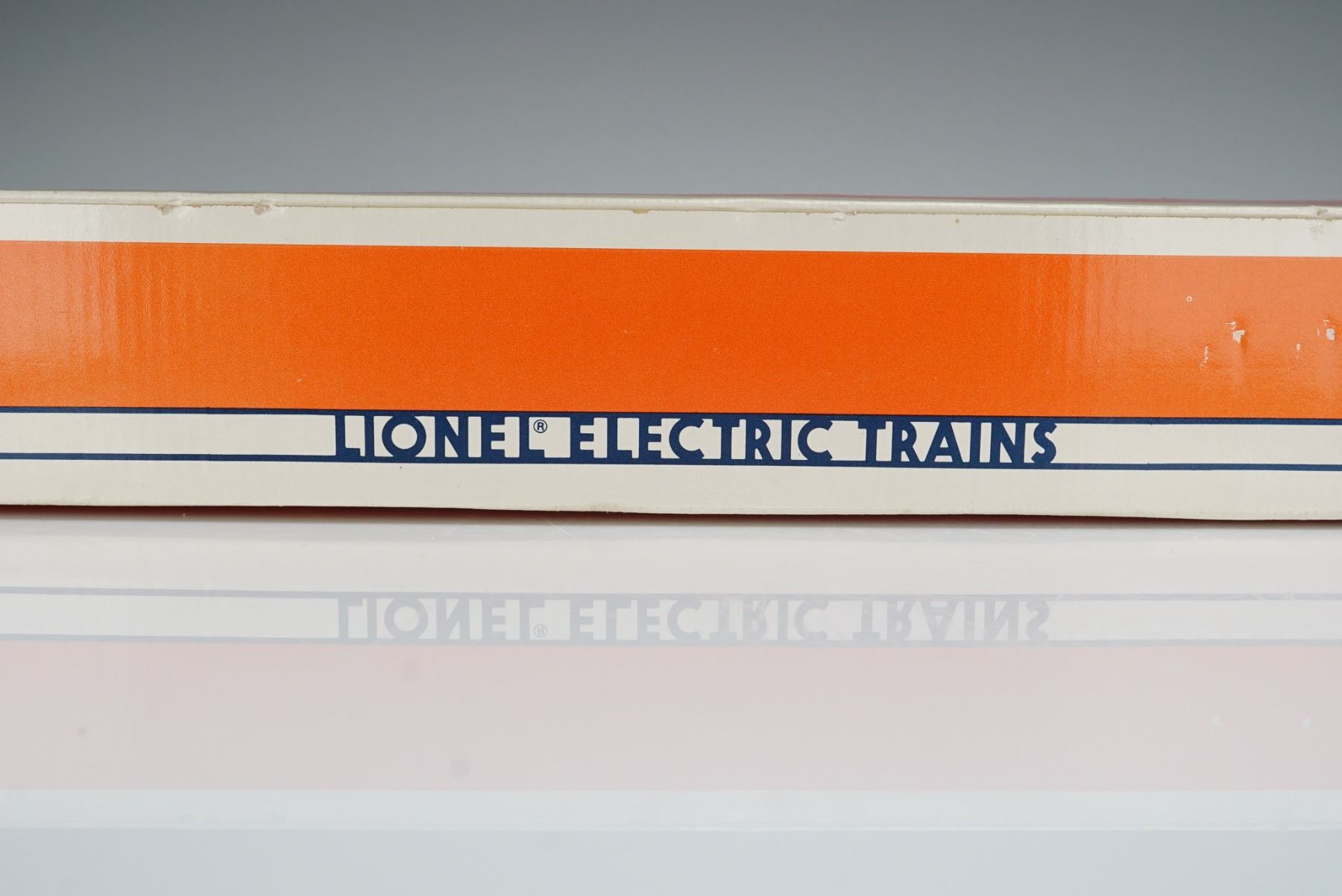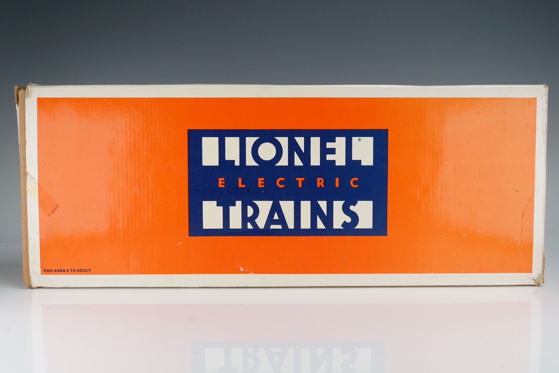 A Lionel Electric Trains No. 5168 remote control switch for 027 gauge layouts, designed for wide-radius 42" curves. This right-hand switch includes integrated remote control capability, allowing operators to manage rail traffic with ease and precision. Marked "Made in China" and featuring Lionel's traditional orange and blue packaging, this unit is ideal for collectors or layout builders seeking authenticity and functionality. The switch itself is approximately 16.5"W and comes housed in a box measuring 6.5"L x 16.5"W.