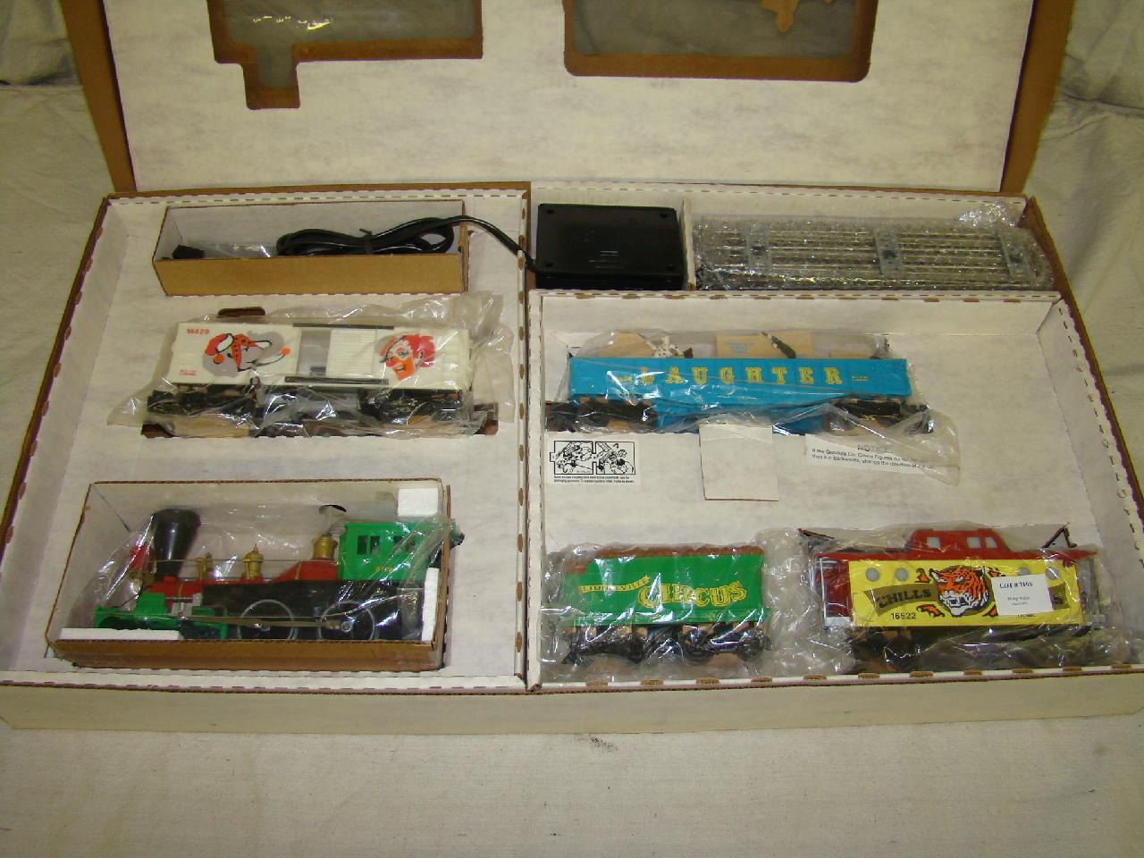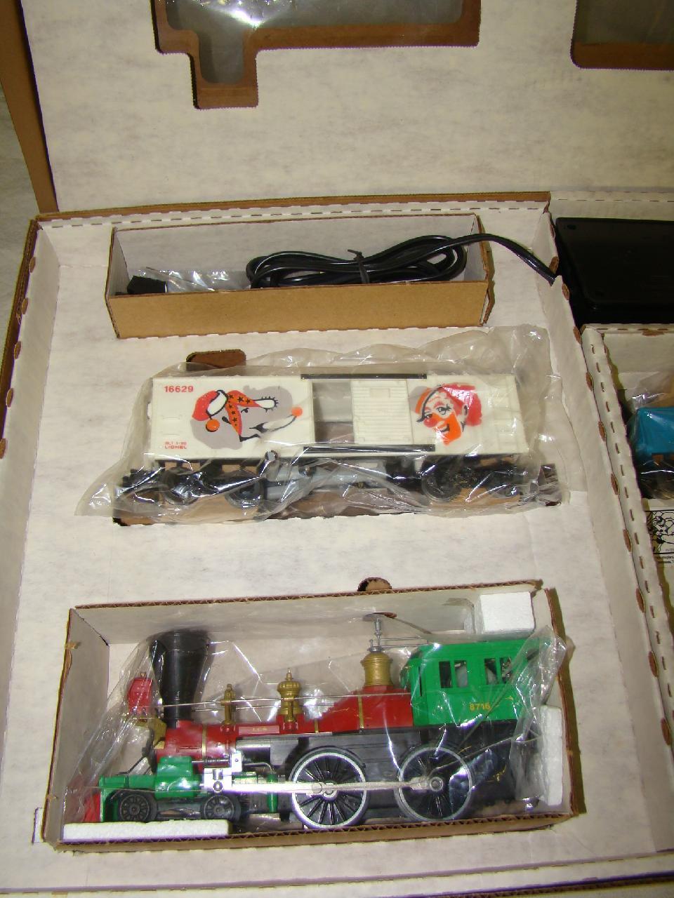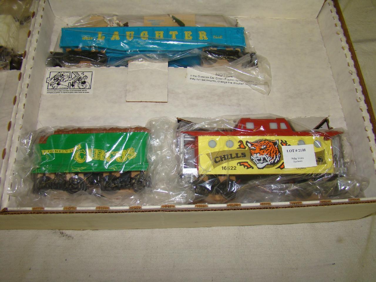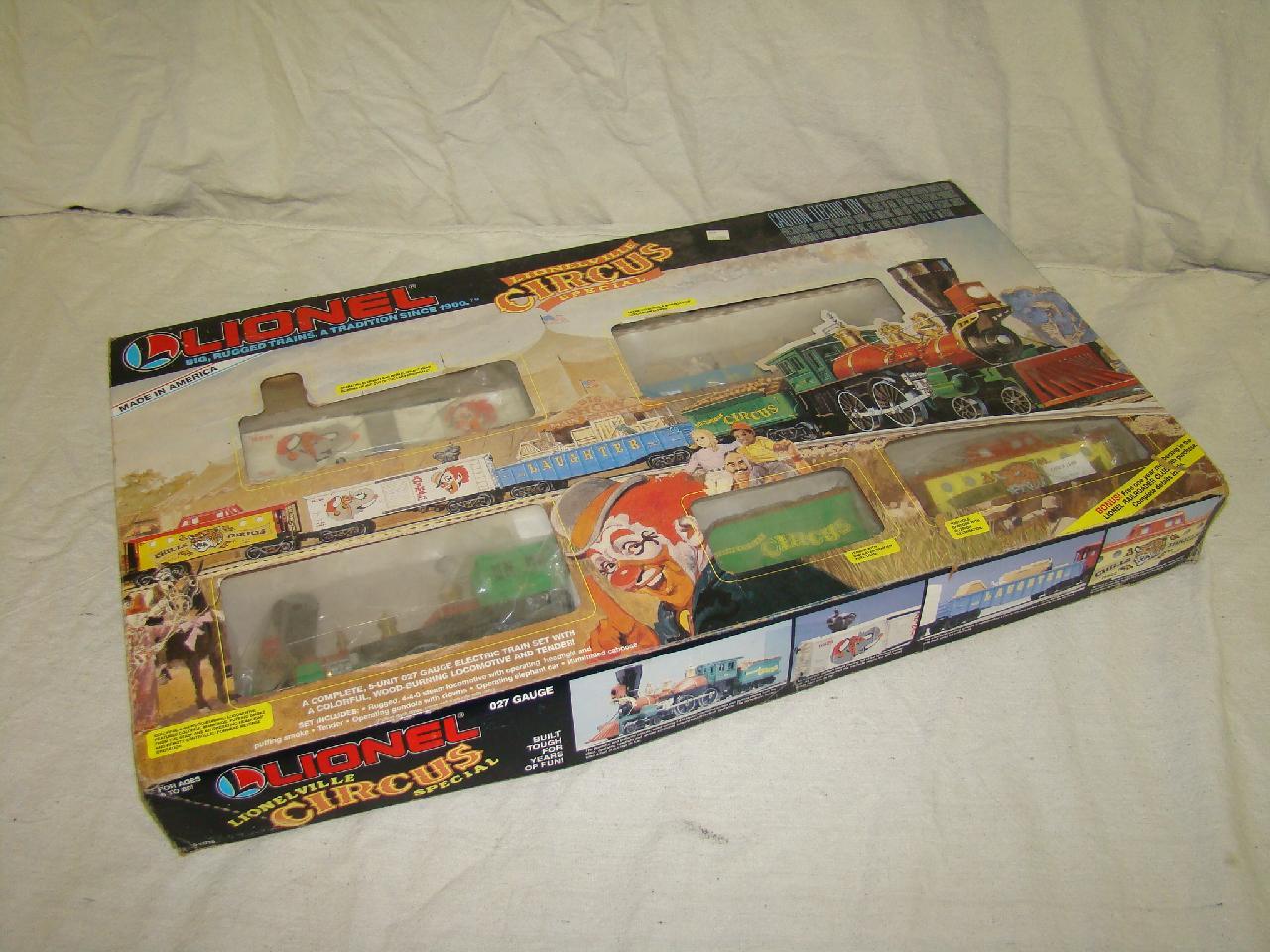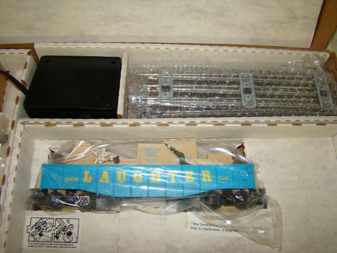 Lionel "O27" gauge train set #6-11716, "Lionelville Circus Special". Includes 8716 Steam Engine and Tender, 16628 Operating Gondola with Clowns, 16629 Operating Elephant Car and 16522 Illuminated Caboose. Track and transformer isalso included. All trains are in original bags and set is unrun. Box cover shows some edge and corner wear with tears, creases, etc...