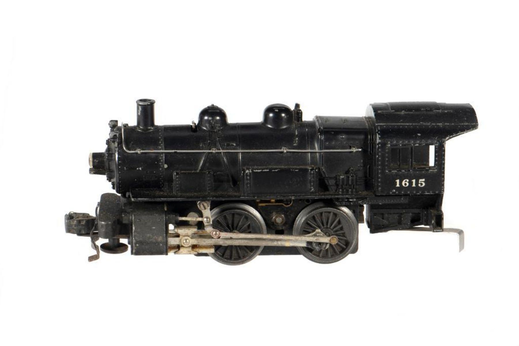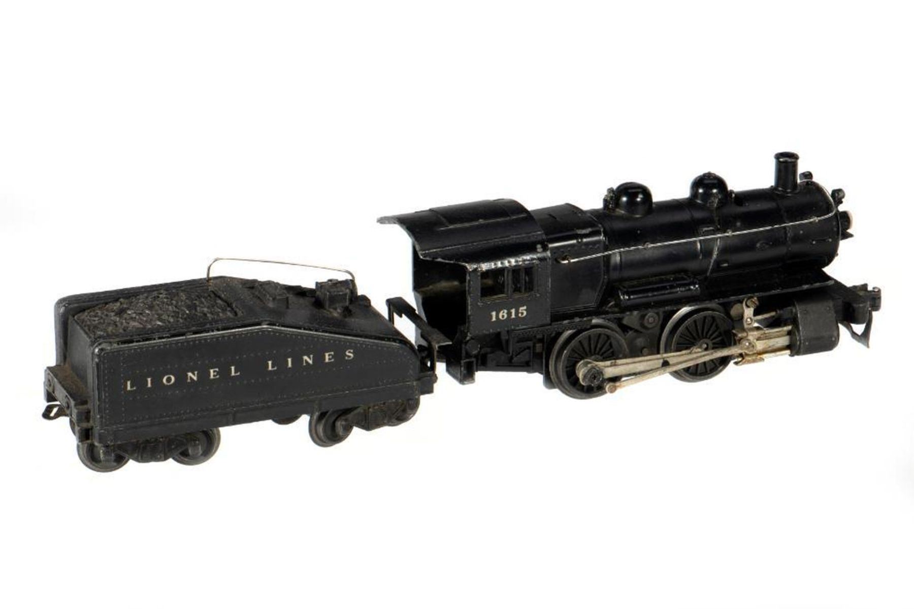Lionel 1615 0-4-0 Locomotive. Marker lights, hand rails, rods, front coupler - intact. 2203T Lionel Lines Slopeback Tender with back up light. Trucks and coupler intact.
