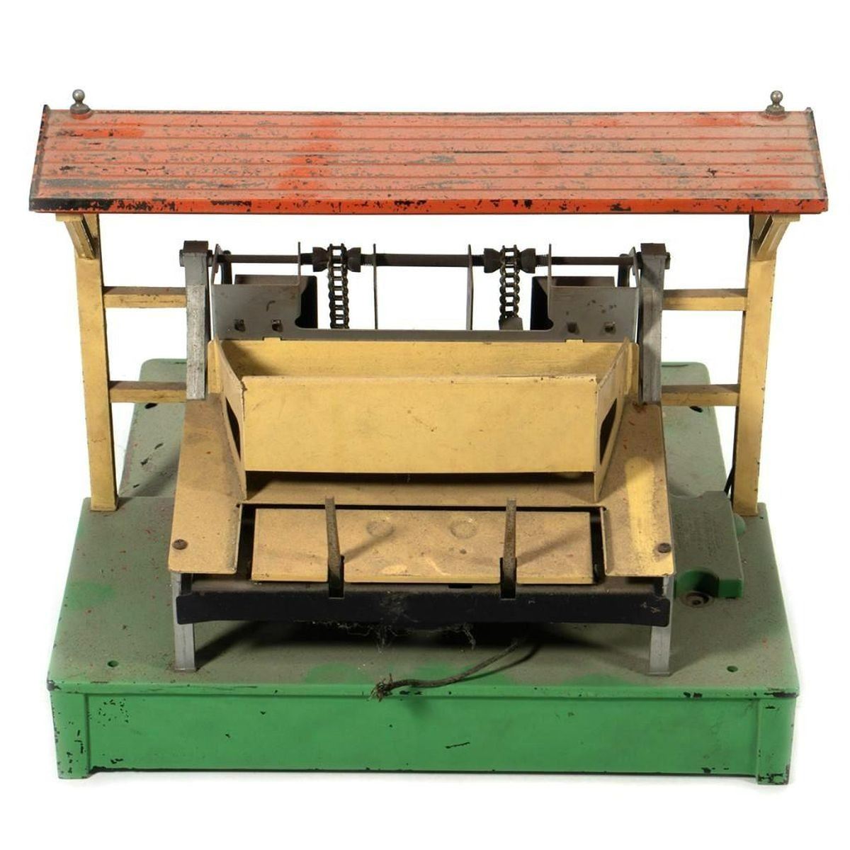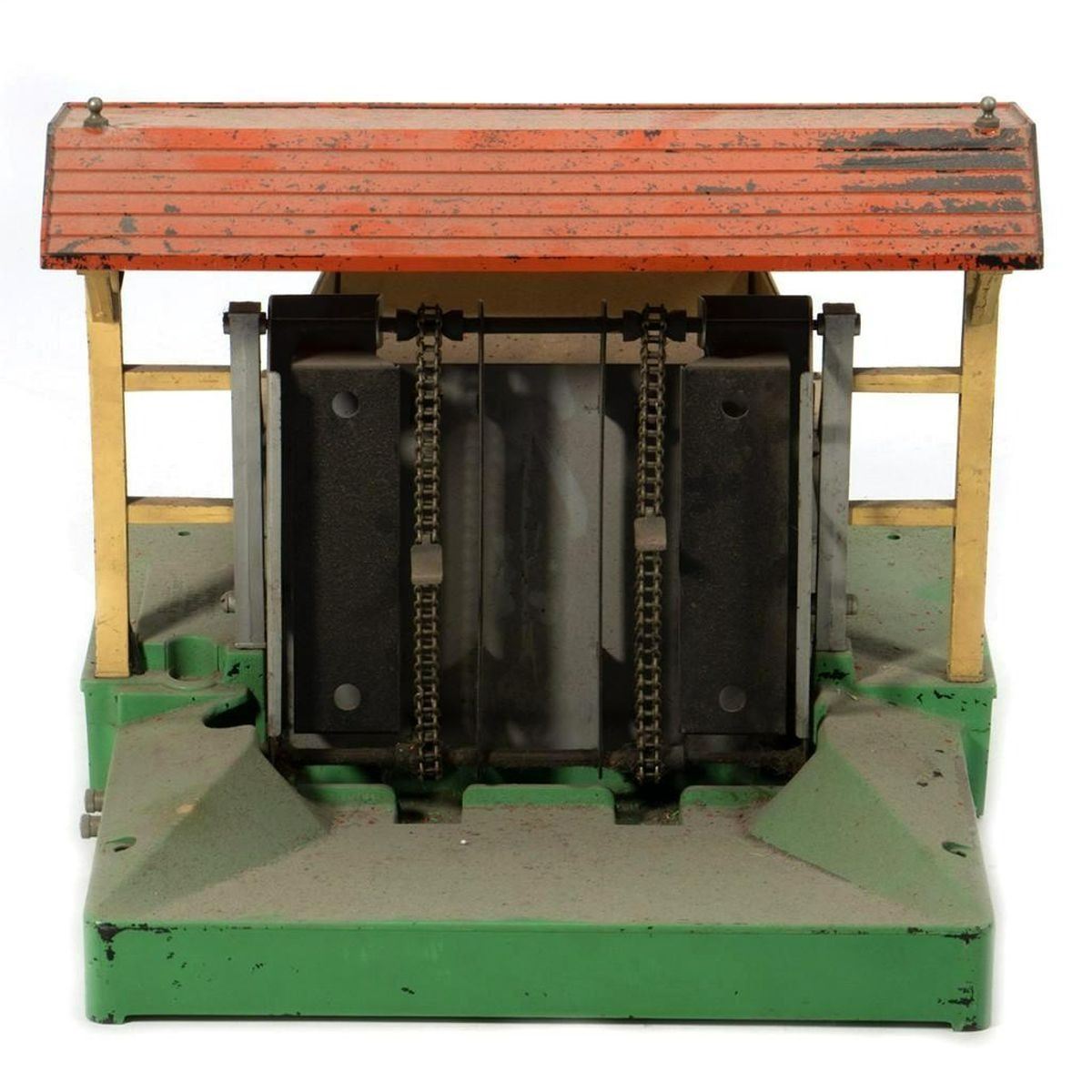 Lionel 164 Log Loader. Peeling paint from red roof, yellow structure, aluminum parts and green base. Wiring and control are missing. Motor is missing. No logs. Very dusty. Basically good for parts or in need of major restoration.