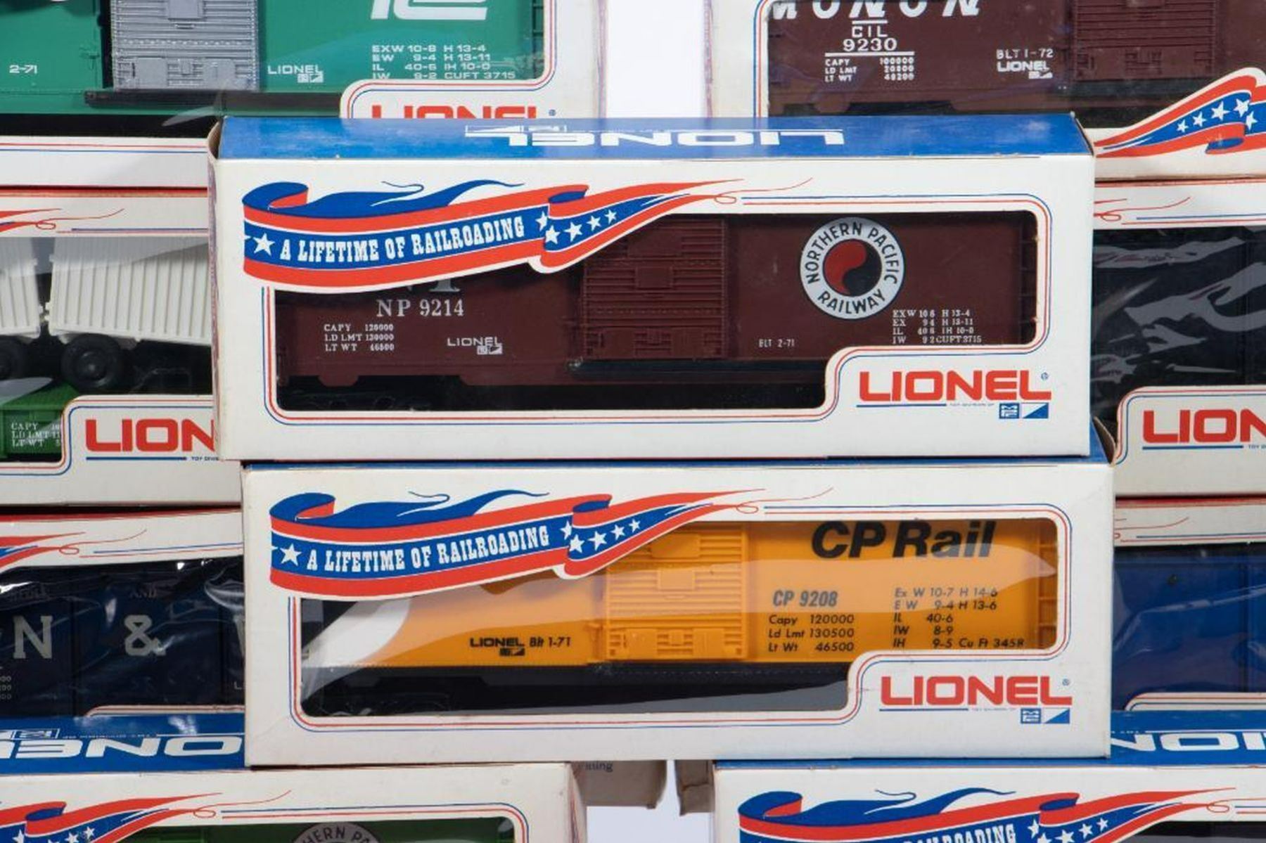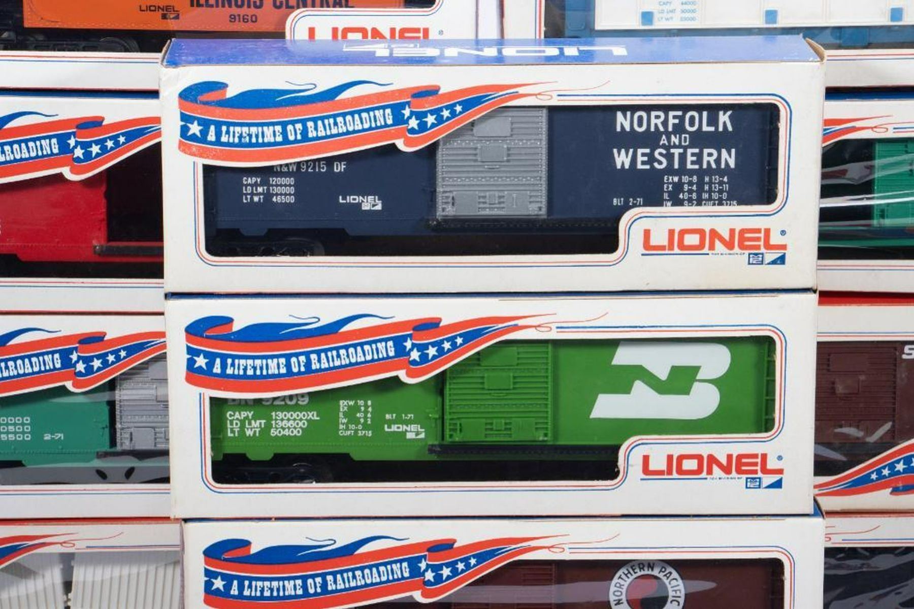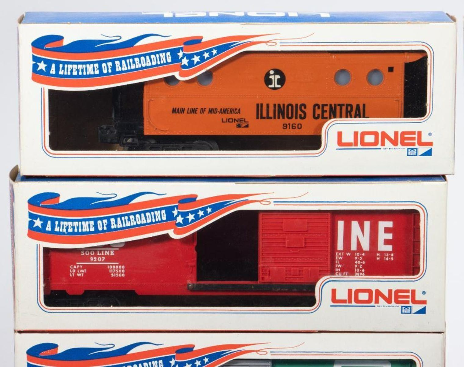 Lionel 18 Freight Cars in "Lifetime of Railroading" Boxes 9210 Baltimore and Ohio Box Car 9204 Northern Pacific Box Car 9207 Soo Line Box Car 9201 Penn Central Box Car 9160 Illinois Central Caboose 9214 Northern Pacific Box Car 9090 General Mills MiniMax Car 9215 Norfolk and Western Box Car 9214 Northern Pacific Box Car 9209 Burlington Northern Box Car 9208 CP Rail Box Car 64645 Timken Box Car 9211 Penn Central Box Car 9230 Monon Box Car 9120 Northern Pacific Flat Car with Trailers 9110 B&O Hopper Car 9130 Baltimore and Ohio Hopper Car 9135 Norfolk and Western Covered Hopper Boxes have storage and shelf wear and tear.