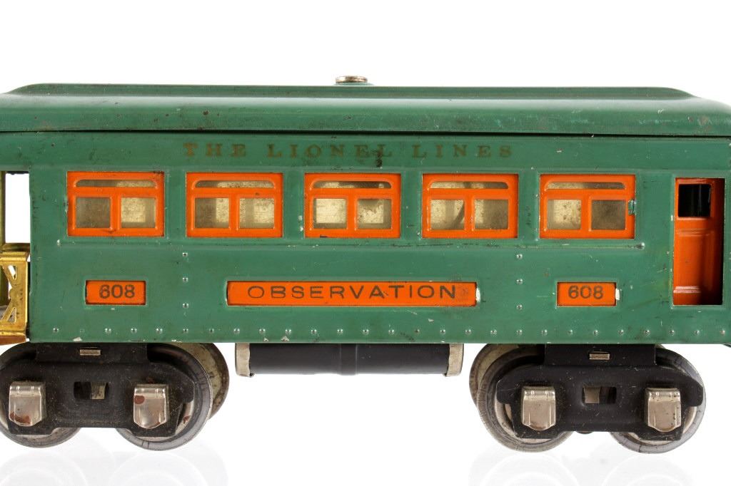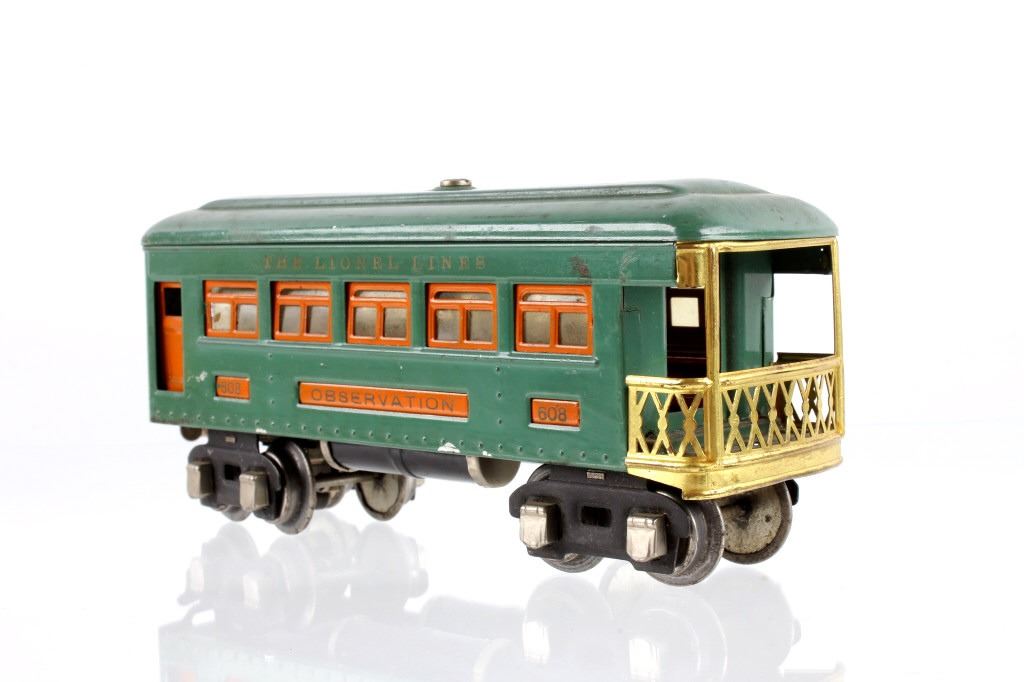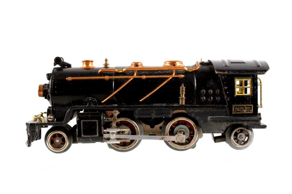 In this lot is a Lionel pre-war train set # 236 "O" gauge. The set is in it's original box. This O gauge set is made entirely of cast metal and includes an engine((262E), a tender(262-T), two Pullman cars(607) and an observation car(608). This is an amazing original set in good condition. The box is 19" X 4" X 13". The cars are approximately 9"-6" long.