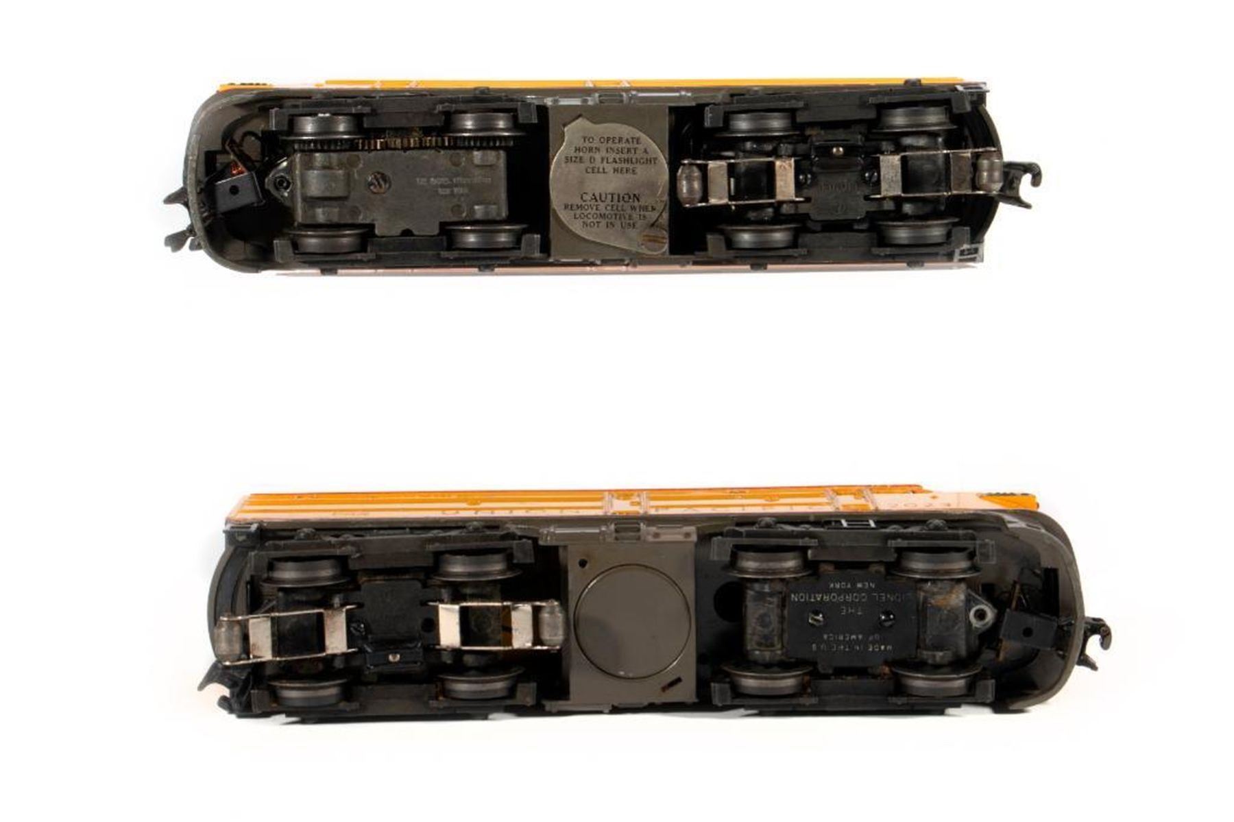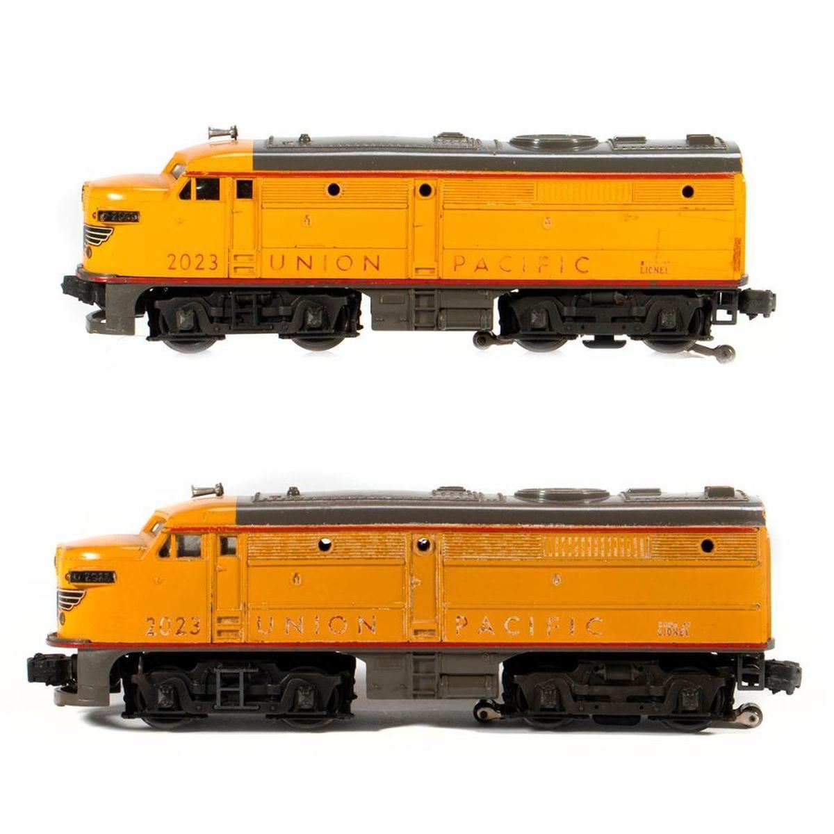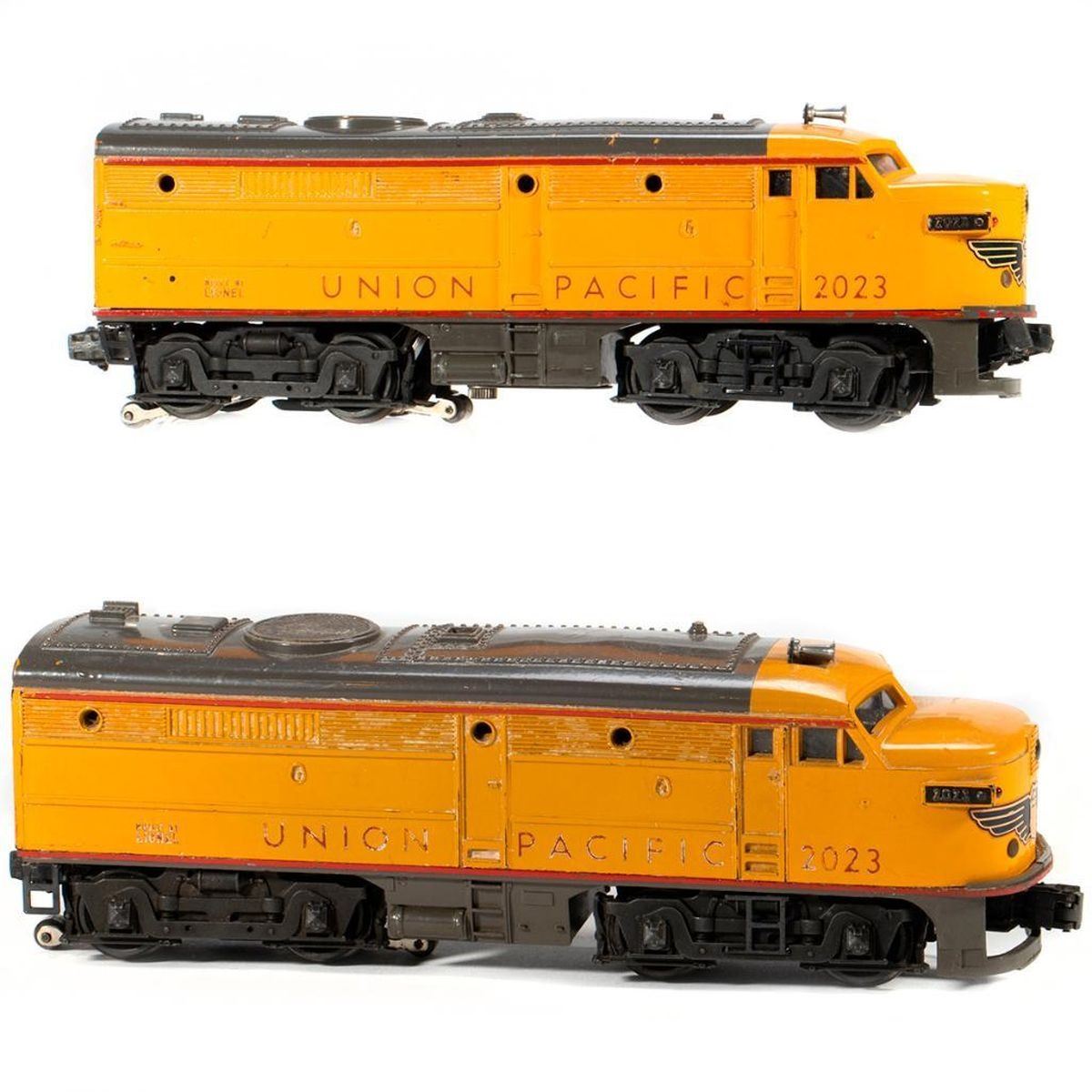 2023 Powered Union Pacific gray and yellow locomotive. Lettering very faded, sticker intact, horn, ladders, couplers intact. Corrosion in battery compartment. 2023 Dummy Union Pacific gray and yellow locomotive. Lettering very faded, sticker intact, horn, ladders, couplers intact. Broken wire at front truck.