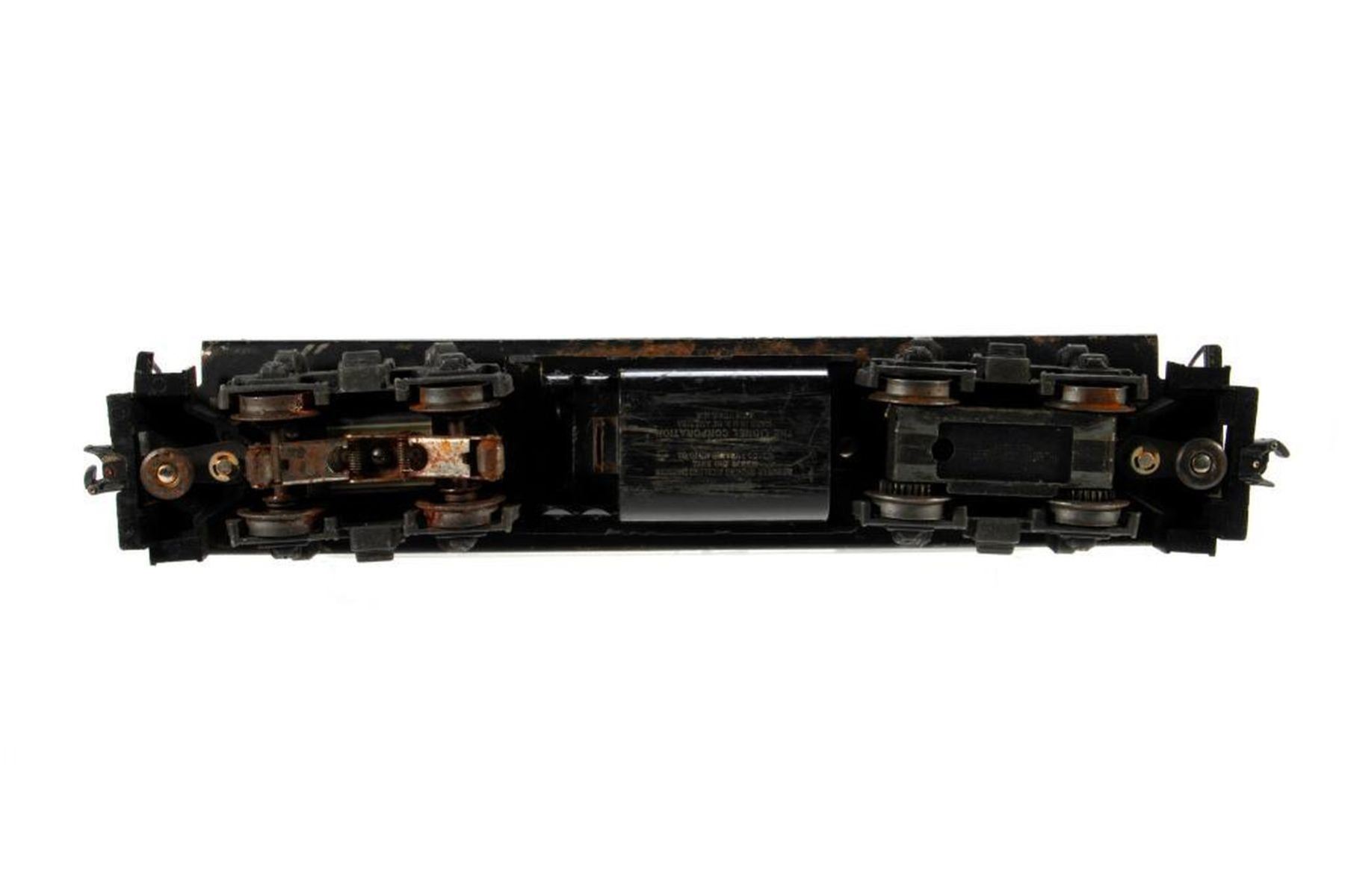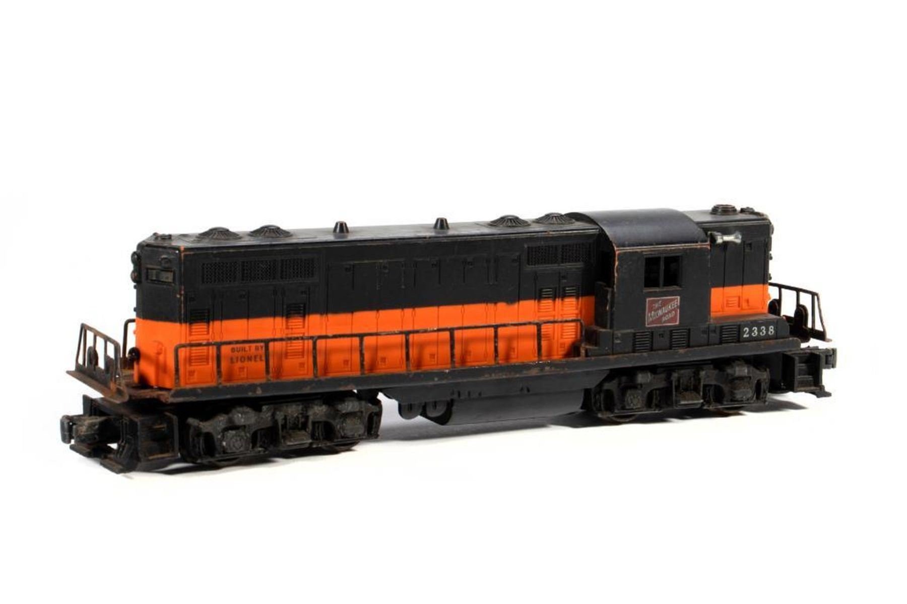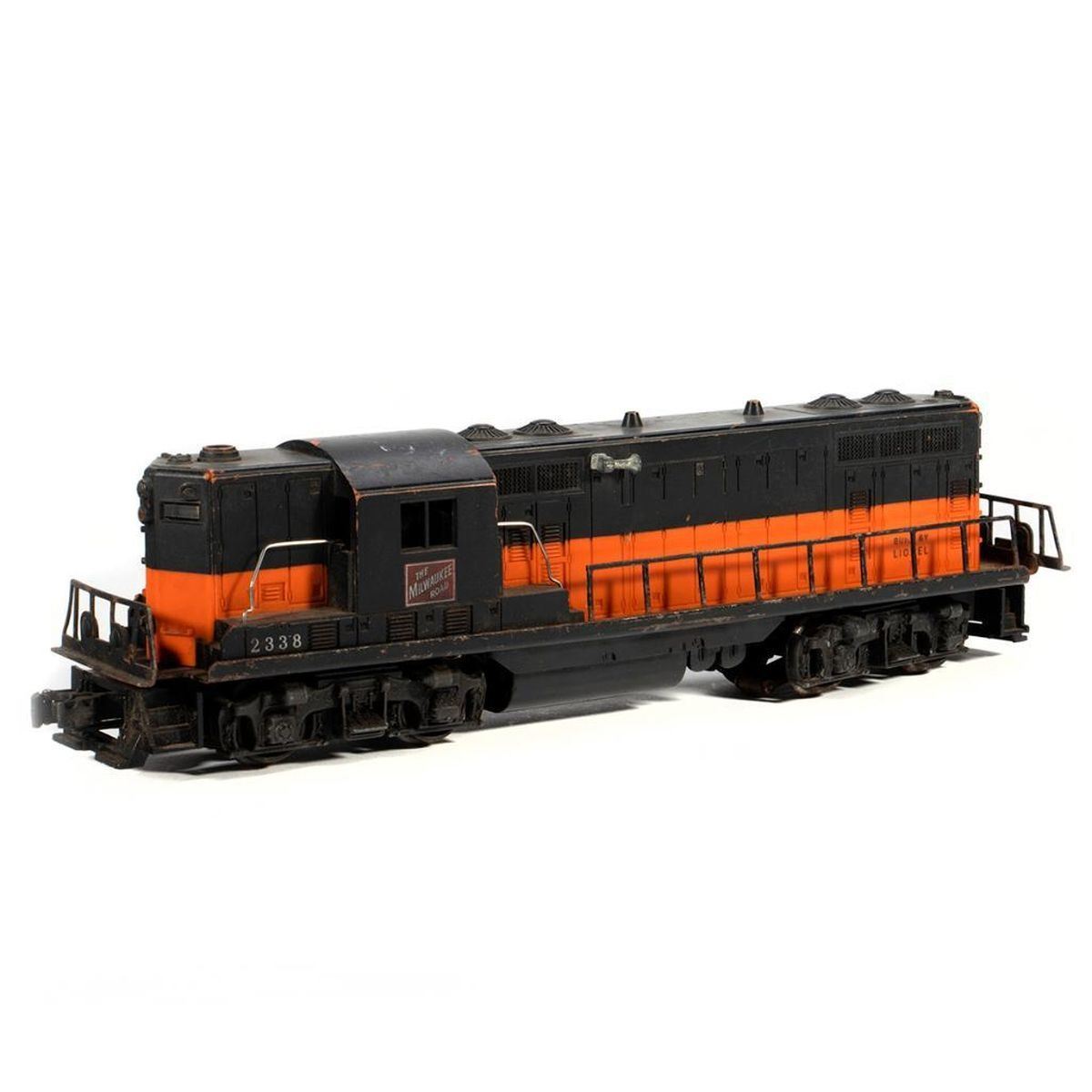 2338 Black and Orange Milwaukee Road GP7. Hand rails and horn - intact. Rust on hand rails, trucks and chassis.Corrosion around battery compartment. Black paint is worn around edges with orange showing through. Dirty. No box.