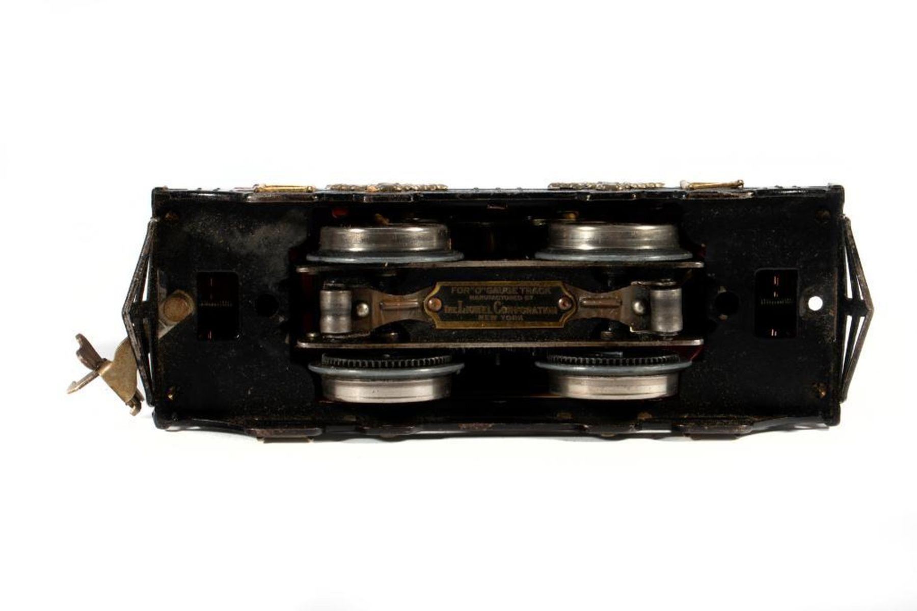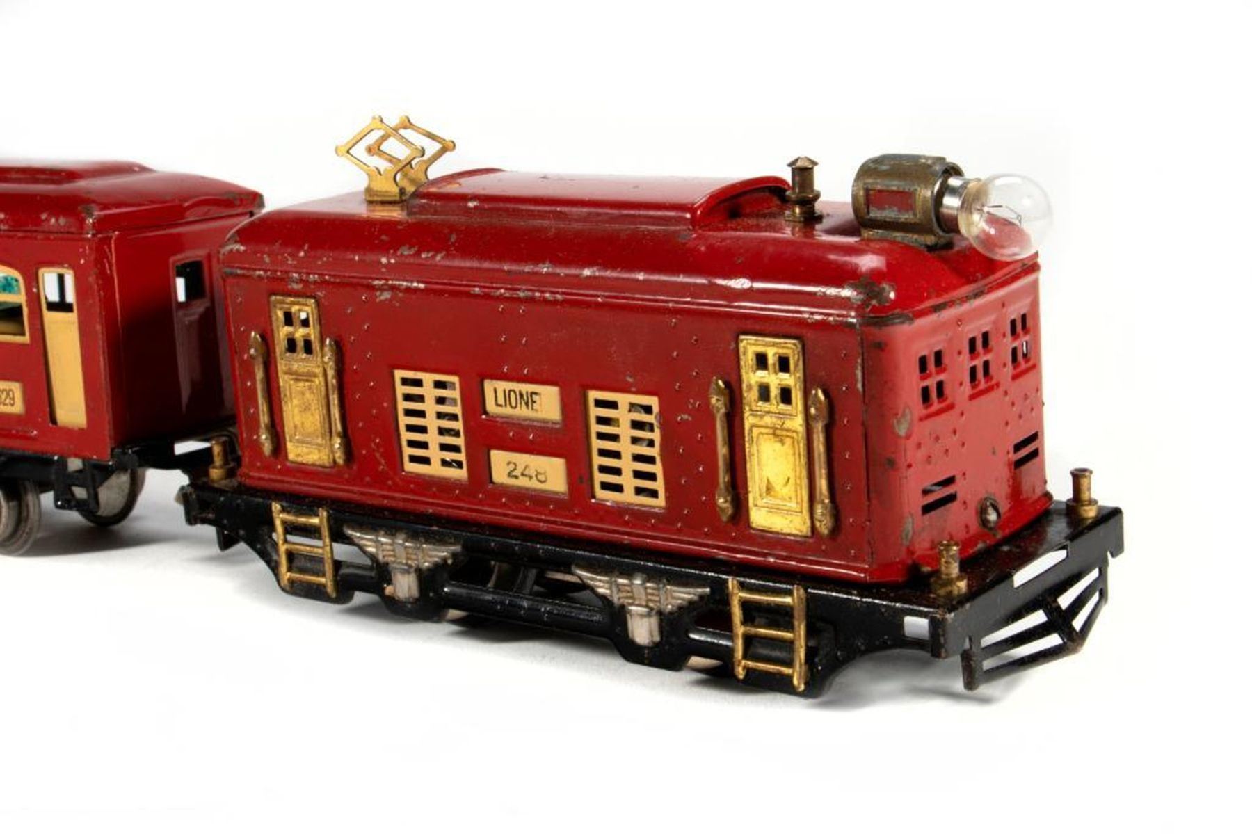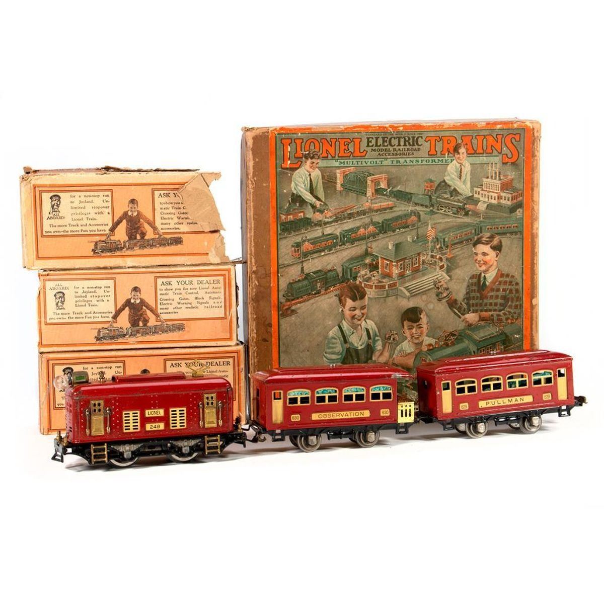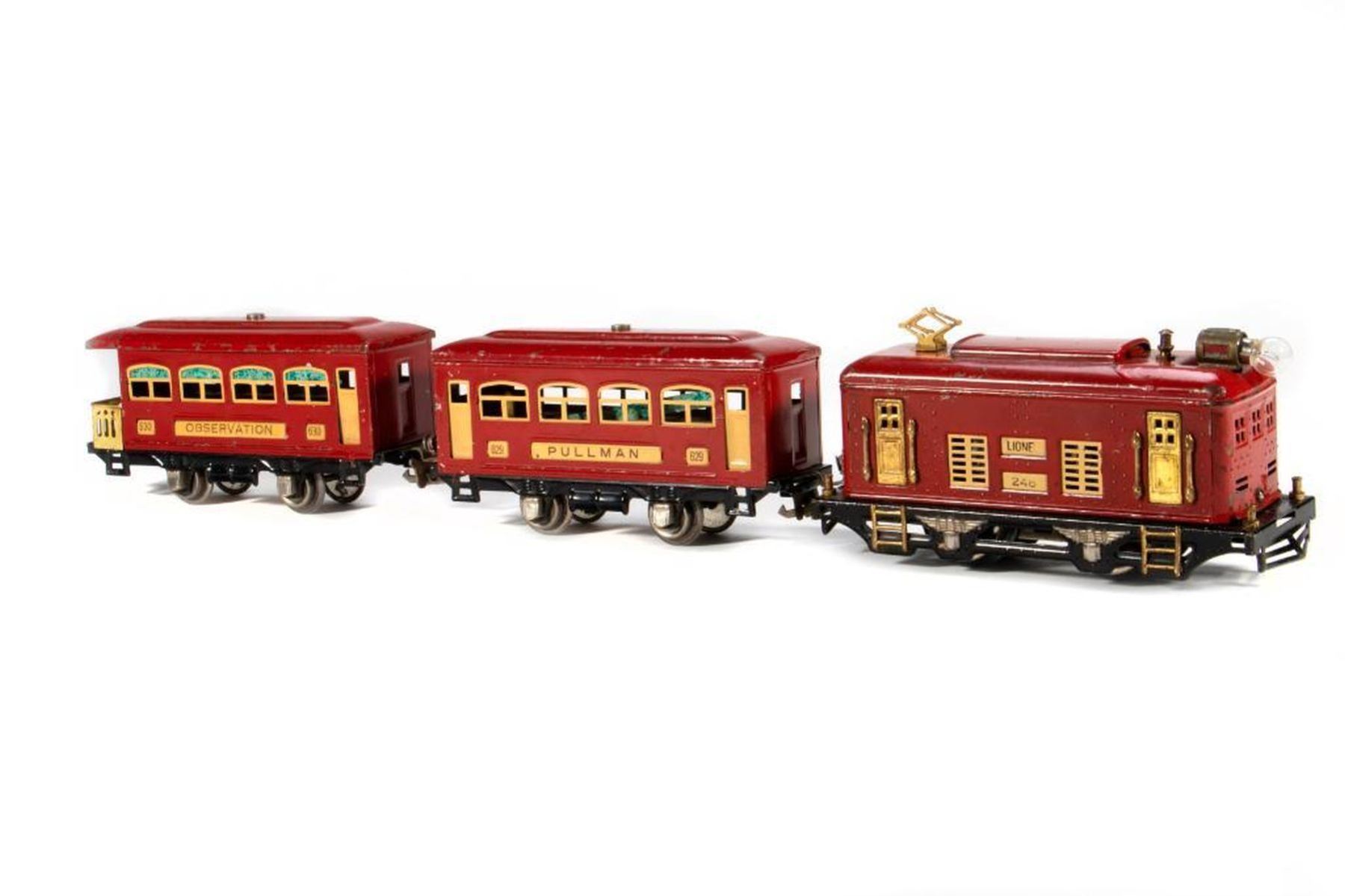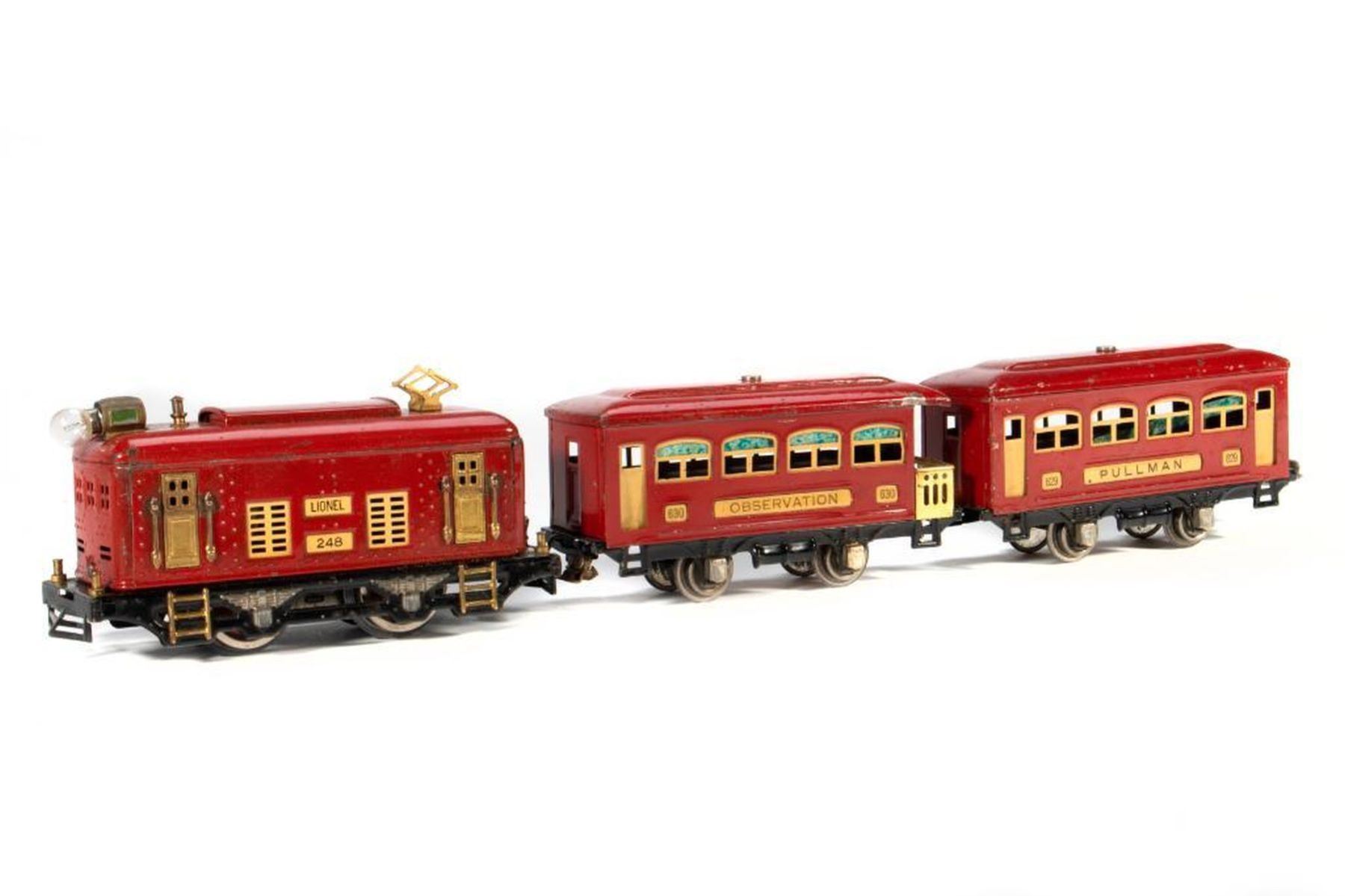 with 248 Red locomotive, 630 Red Pullman, 629 Red Observation, Set Box, Ragged Car and Locomotive Boxes, Locomotive has pantograph, headlight, whistle, springs, ladders, handrails. Wheels turn freely. 629 Pullman - one side of colored window insert is loose, chrome journal boxes all present. 630 Observation - chrome journal boxes all present. Clean set with light wear and tear.