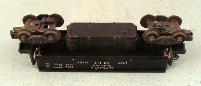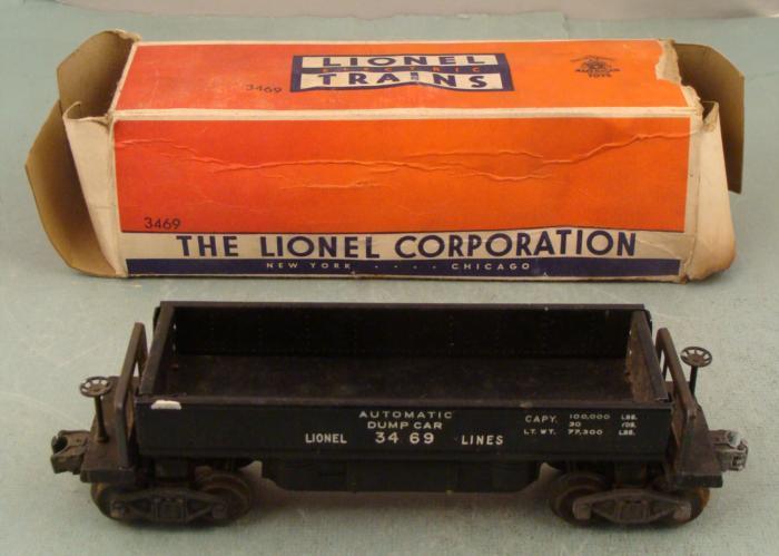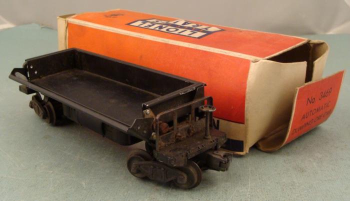 This is a Lionel #3469 O gauge Automatic Dump Car, made during the postwar era. It has not been track-tested, but appears to be in good condition, with only a few spots of minor paint wear. It features a tipping bed with opening side, which hangs down just a little. The original box is included, and it has some normal wear and tear and denting.