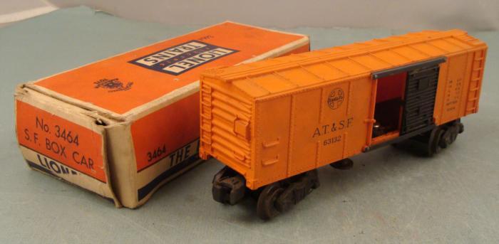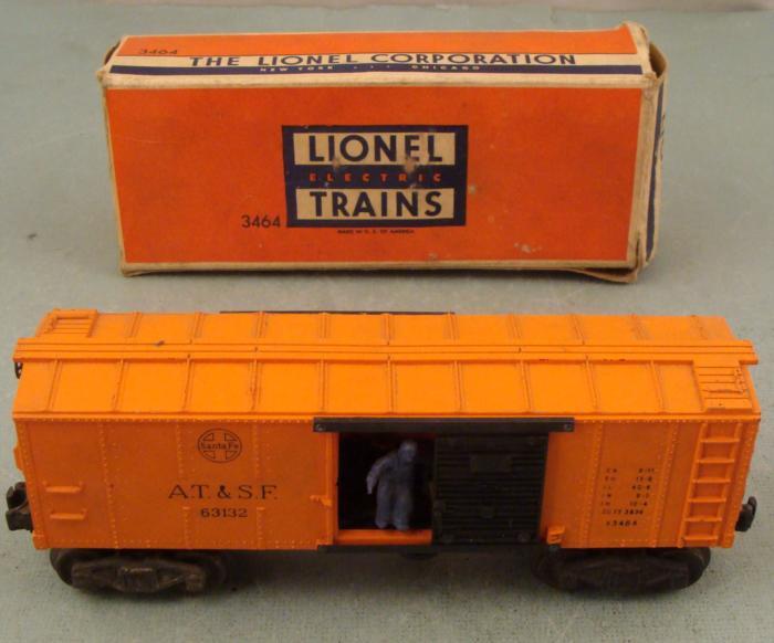 This is a Lionel #3472 O gauge refrigerated milk car with platform, made around 1950. These have not been track-tested, but appear to be in good condition, and come in the original box, which has some wear.