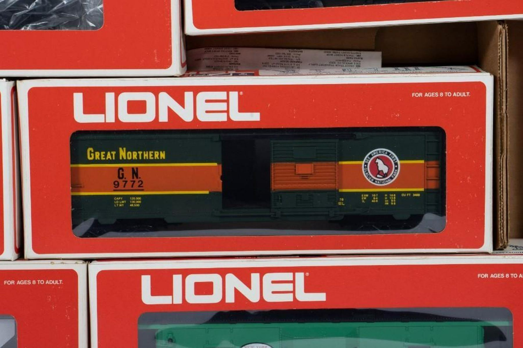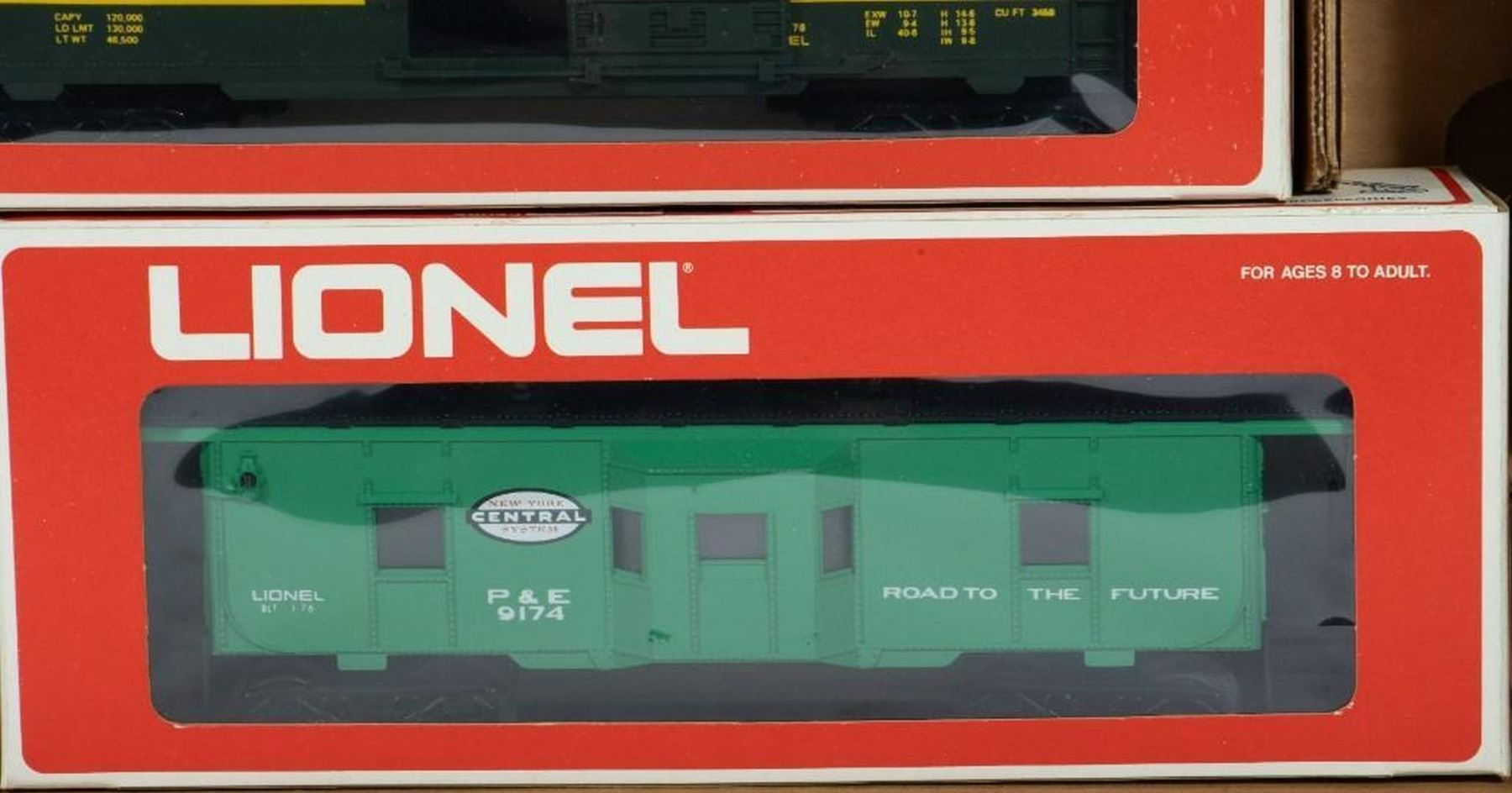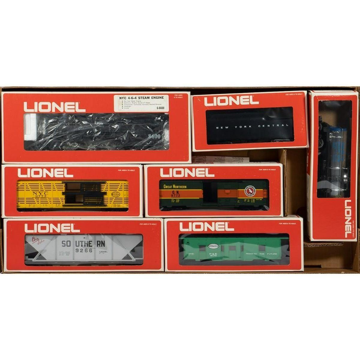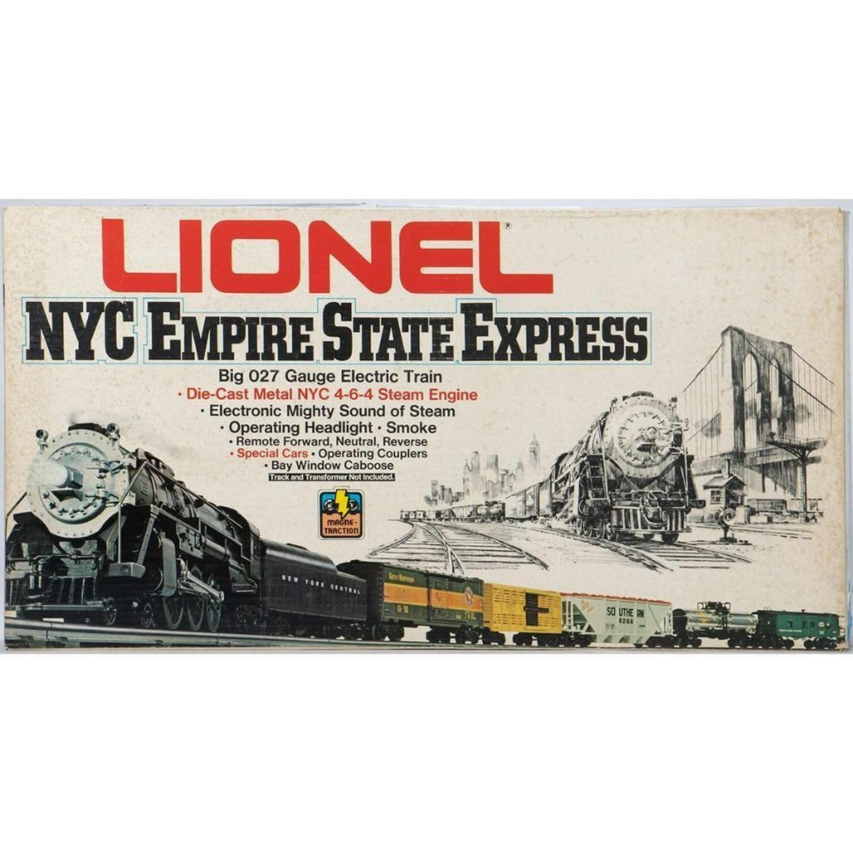 Lionel O gauge 6-1665 New York Central Empire State Express Set. 6-8600 4-6-4 Steam Locomotive and tender, 9773 NYC Stock Car, 6-9772 Great Northern Box Car, 9266 Southern Hopper Car, 9159 Sunoco Tank Car and 9174 NYC Caboose. all in original individual boxes and in set box. Individual boxes are brick. Set box has foxing and shelf wear and tear. One end has staples popped loose. Includes warranty card and Fundimensions Lionel order sheet.
