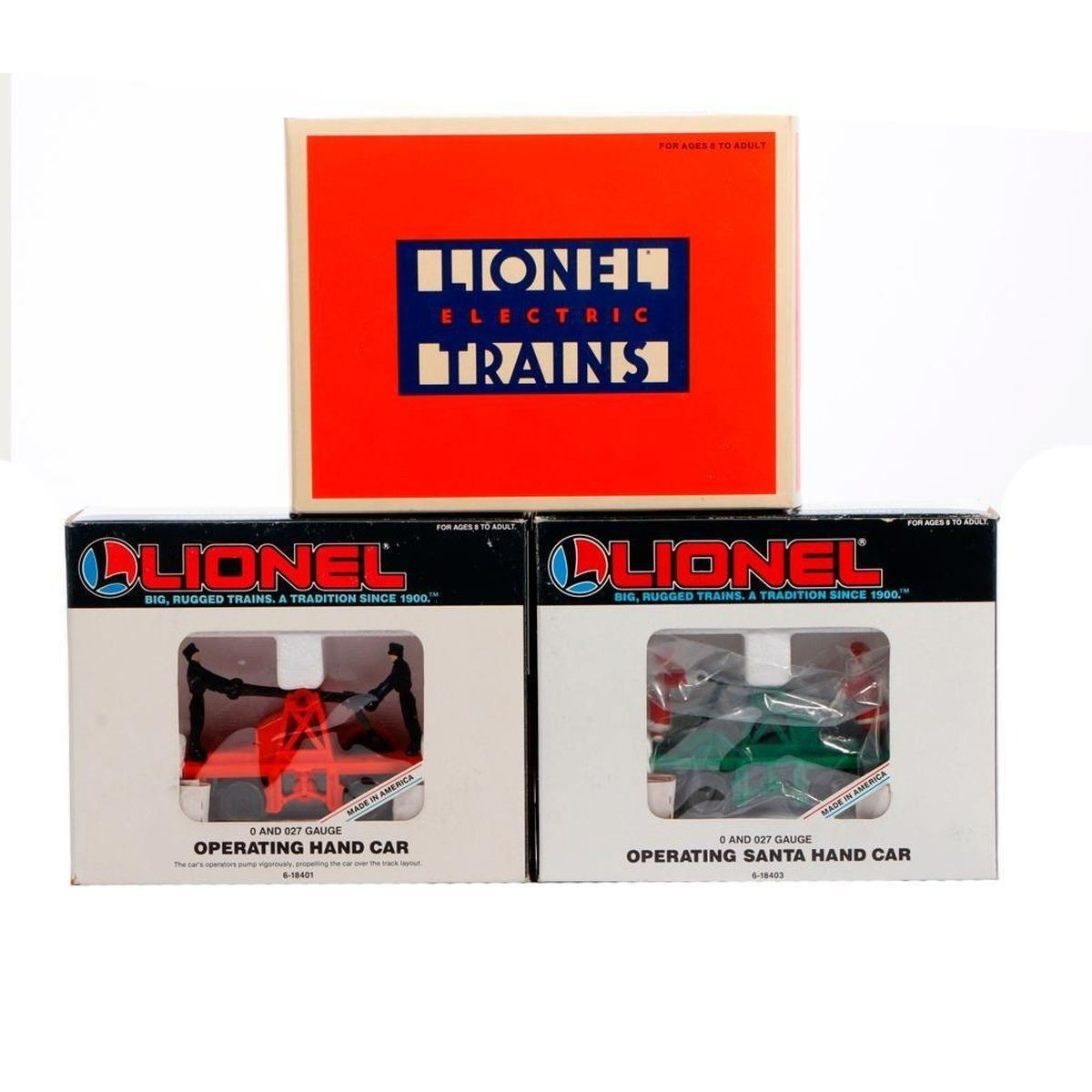 Lionel 6-18406 Operating Track Maintenance Car with reversing action. Original box. Lionel 6-18401 Operating Hand Car in original box Lionel 6-18403 Operating Santa Hand Car in original box