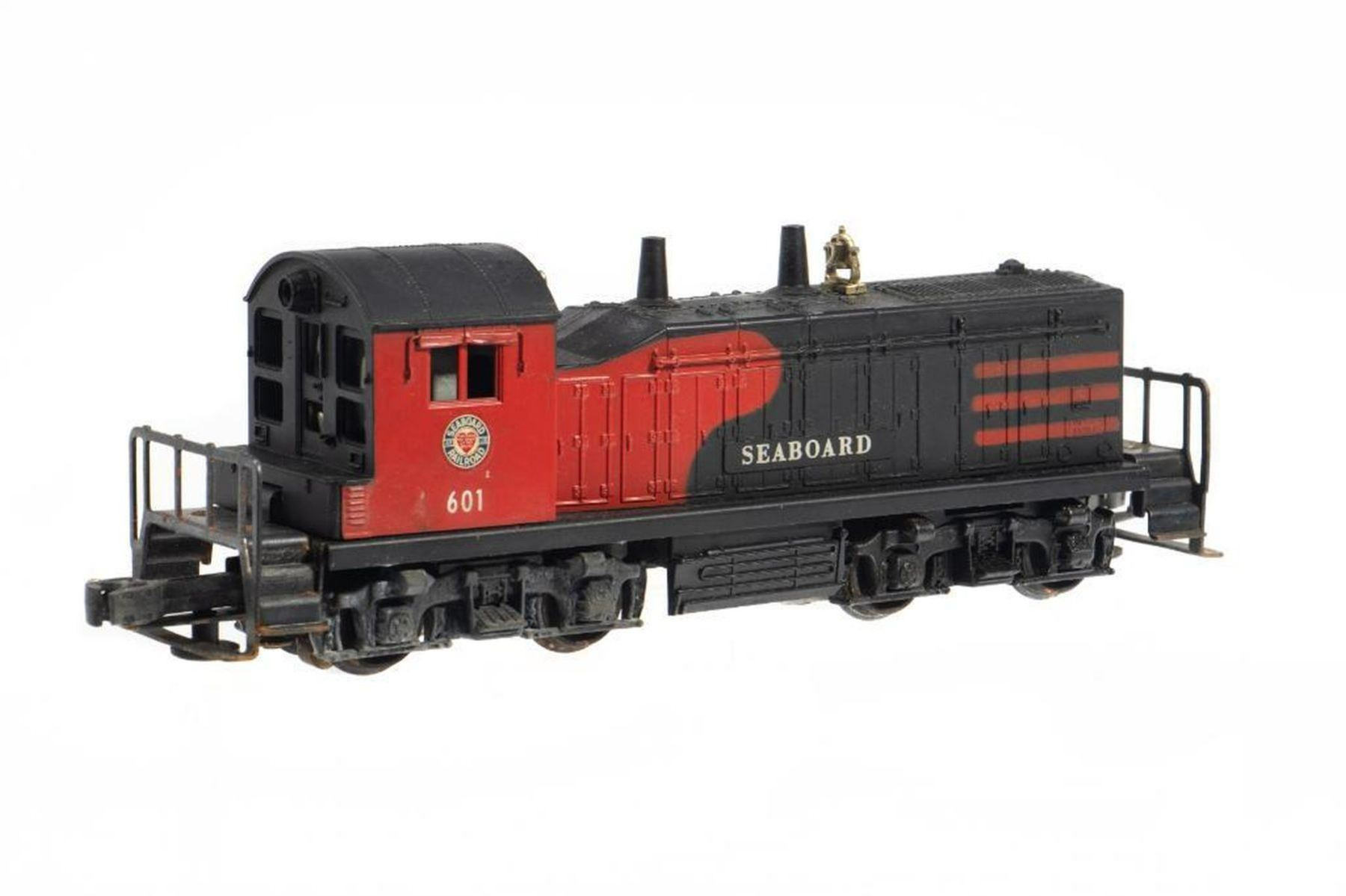 Lionel Postwar 601 Seaboard NW2 Diesel Switcher.: Bell, stacks, horn, struts intact.: Rust on pickups.: Trucks and couplers intact.: Rust spots on chassis and wheels.: Scuffs on cab roof.: