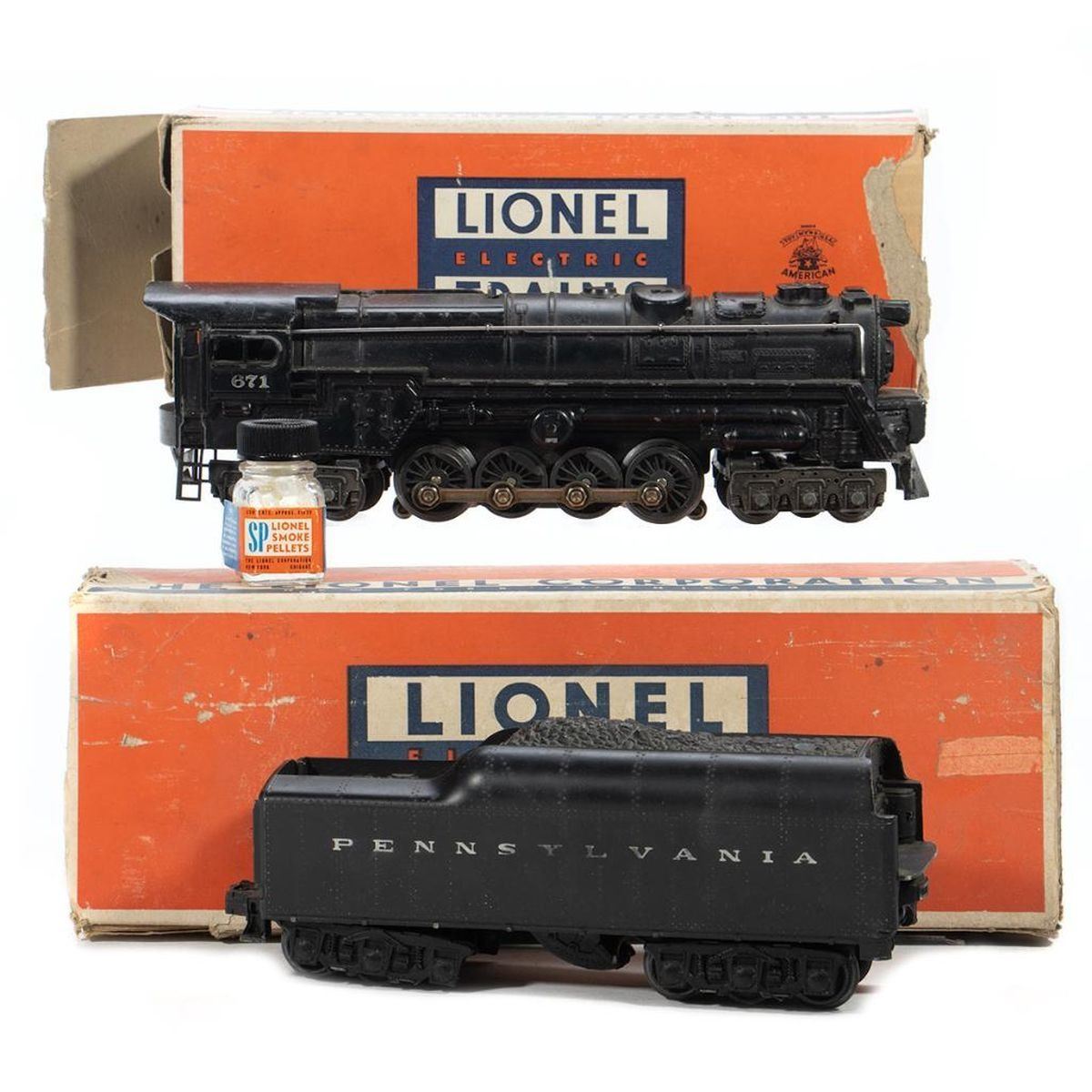 671; Used Postwar; Lionel 671 Pennsylvania Steam Turbine. 6-8-6. Dusty, paint worn in the usual spots. Has box with liner but no end flaps and has other damage. Hand rails and steps intact. 2671W; Used Postwar; Lionel 2671W lettered Pennsylvania. Lettering worn in the middle where the tender is naturally picked up. Steps intact. Dusty with some edge wear in the paint. Box is present but missing flaps SP; Used Postwar; Bottle with smoke pellets - mostly full