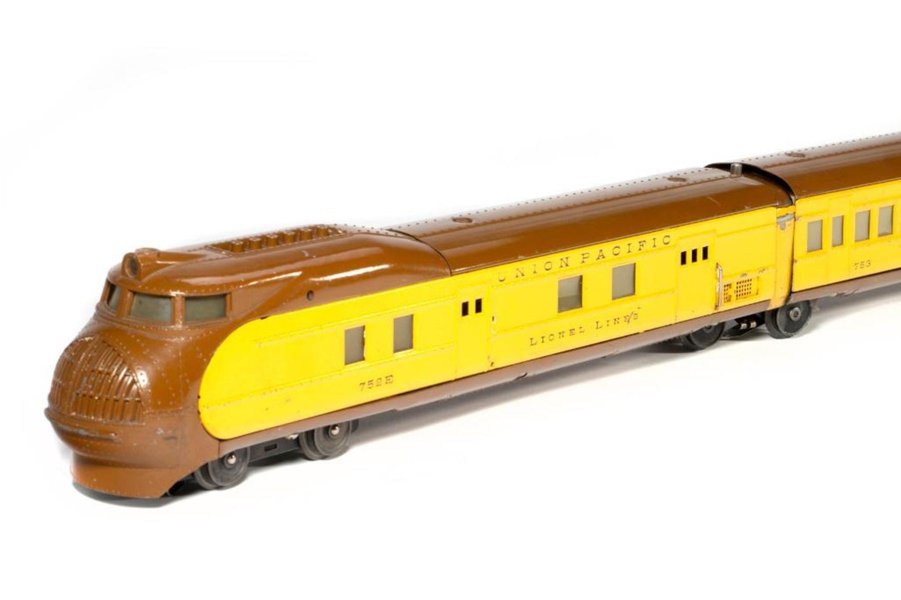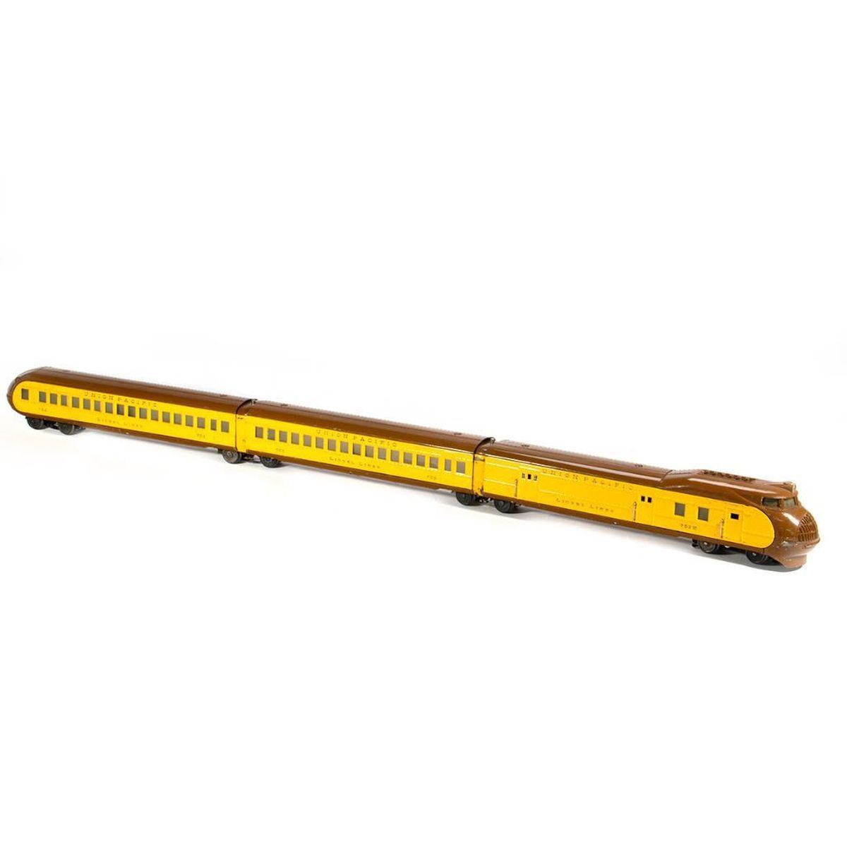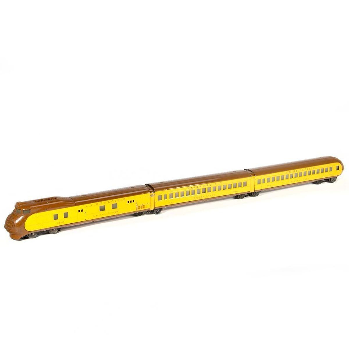 Locomotive, coach, observation, two vestibules. Little paint wear, minimum casting swelling. Pickup wear.