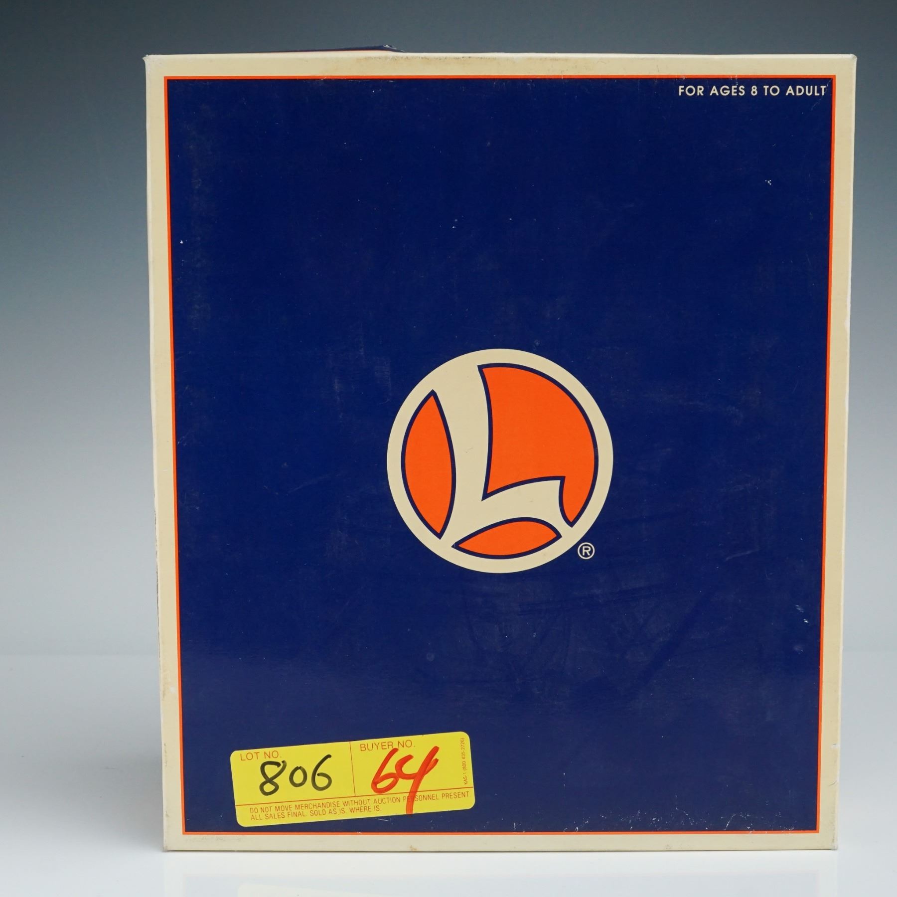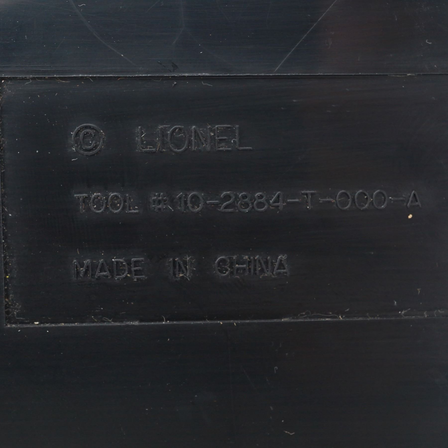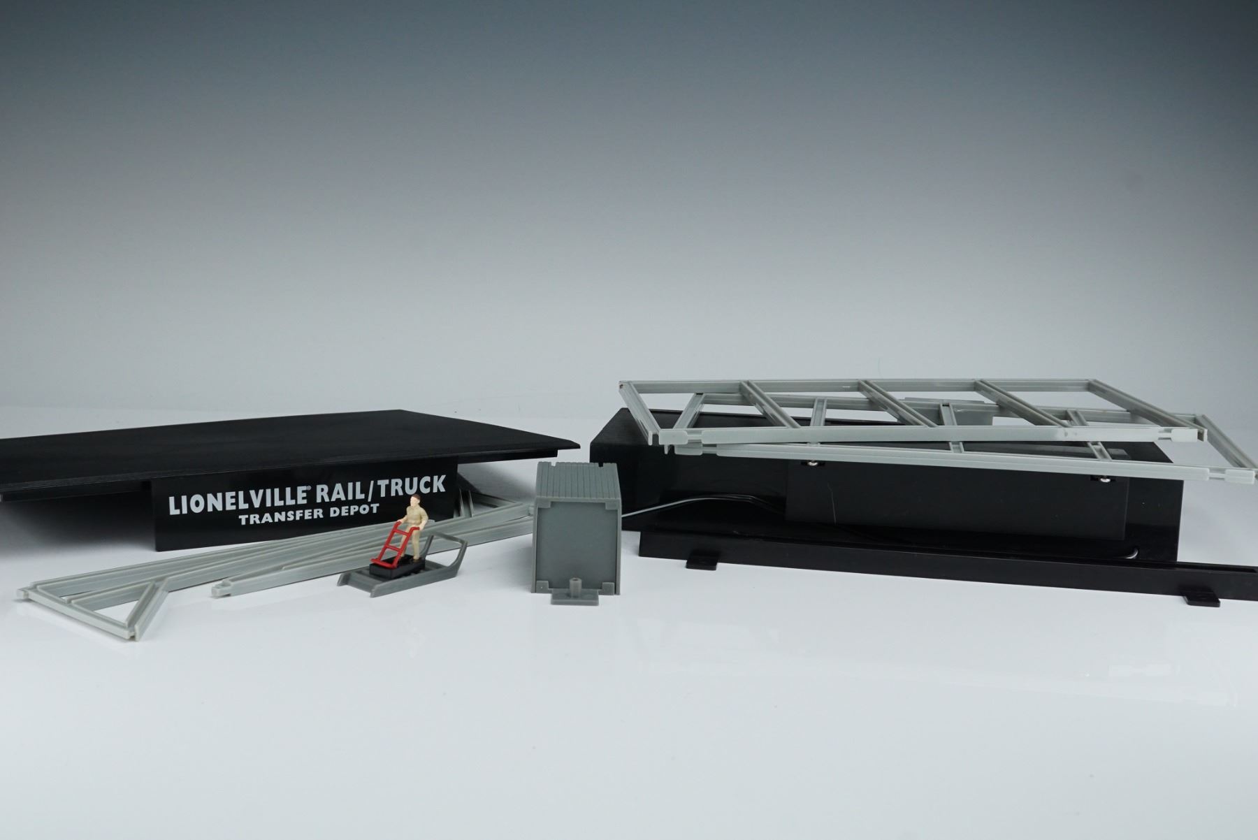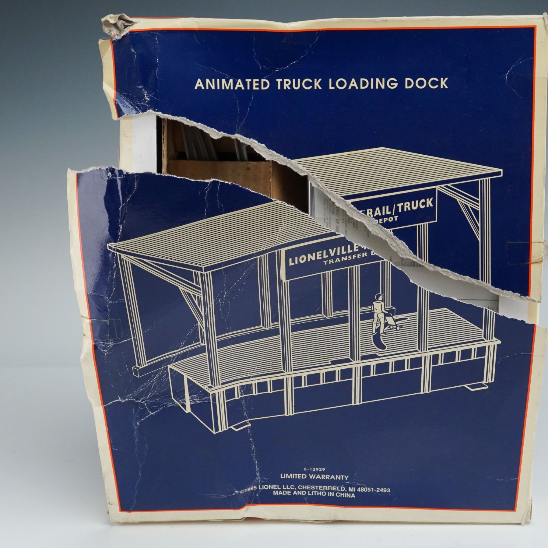 Lionel Animated Truck Loading Dock, also known as the Lionelville Rail/Truck Transfer Depot, Tool #6-12929 detailed plastic model features an animated figure with a hand truck on a sliding track system and accompanying accessories designed to simulate a bustling rail-to-truck loading platform. Marked "Lionel, Made in China" on the underside, this item is an authentic Lionel LLC product manufactured in 1995 in Chesterfield, MI. Comes in the original Lionel packaging, which shows heavy tearing and creasing, particularly along the front side of the box. Includes various structural parts for assembly and electrical components for animation. Box measures 9.5"L x 11"W x 2.75"H.