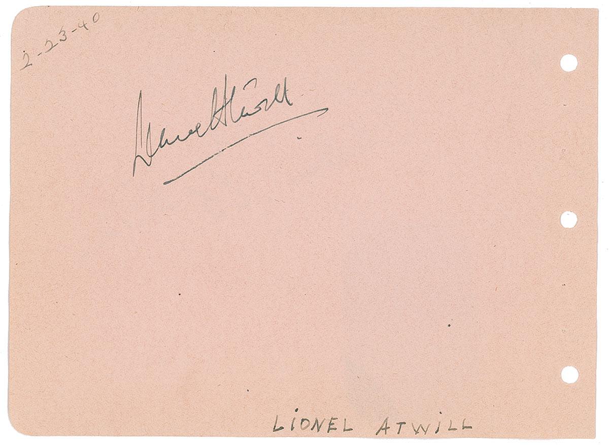 British actor (1885–1946) best known for his roles in such horror films as Mark of the Vampire and Son of Frankenstein and as Moriarty to Basil Rathbone’s Sherlock Holmes. Vintage fountain pen signature, “Lionel Atwill,” on a light pink 6 x 4.25 album page. A few faint bends and light surface wear, and show-through from a signature of small photo affixed to the reverse, all of which could be matted out if so desired, otherwise fine condition.