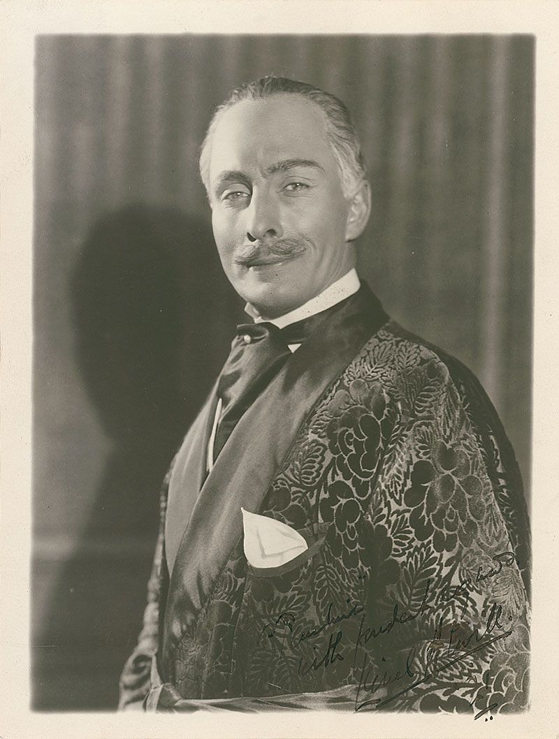British actor (1885–1946) best known for his roles in such horror films as Mark of the Vampire and Son of Frankenstein and as Moriarty to Basil Rathbone’s Sherlock Holmes. Early distinguished vintage matte-finish 6.5 x 8.5 photo of Atwill in a smoking jacket, signed and inscribed in fountain pen “Pauline, with fondest regards, Lionel Atwill ‘21.” Rippling to vertical edges, adhesive remnants on reverse, and light to moderate contrast to signature and inscription, otherwise fine condition.