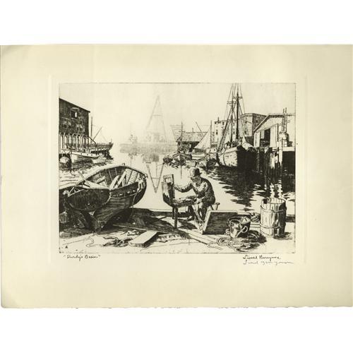<B>Lionel Barrymore Signed Etching.</B></I> This "Talio-Crome" reproduction of Lionel Barrymore's etching <I>Purdy's Basin</B></I> provides an attractive dock scene and Barrymore's signature, penned below his printed name under the right corner of the picture. Excellent condition. This a fine example of Barrymore's signature and his impressively diversified talents.<BR><BR><b>Shipping:</b> Flat Material, Large (<a target="_blank" href="http://www.heritageauctions.com/common/shipping.php">view shipping information</a>)