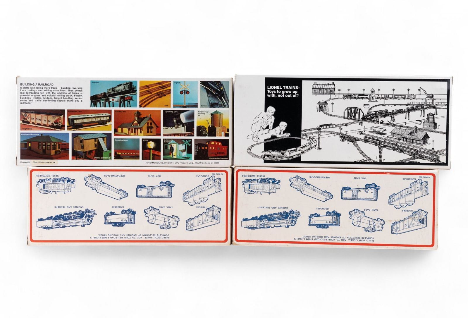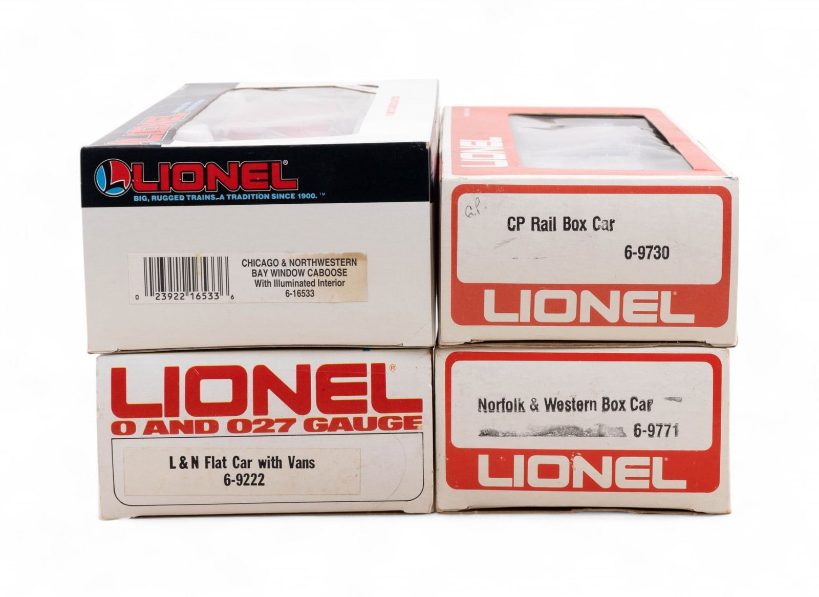 NIB Lionel #6-9730 CP Rail Boxcar, #6-9771 Norfolk & Western Boxcar, #6-9222 L&N Flat Car with Vans, #6-16533 Chicago Northwestern Bay Window Illuminated Caboose.