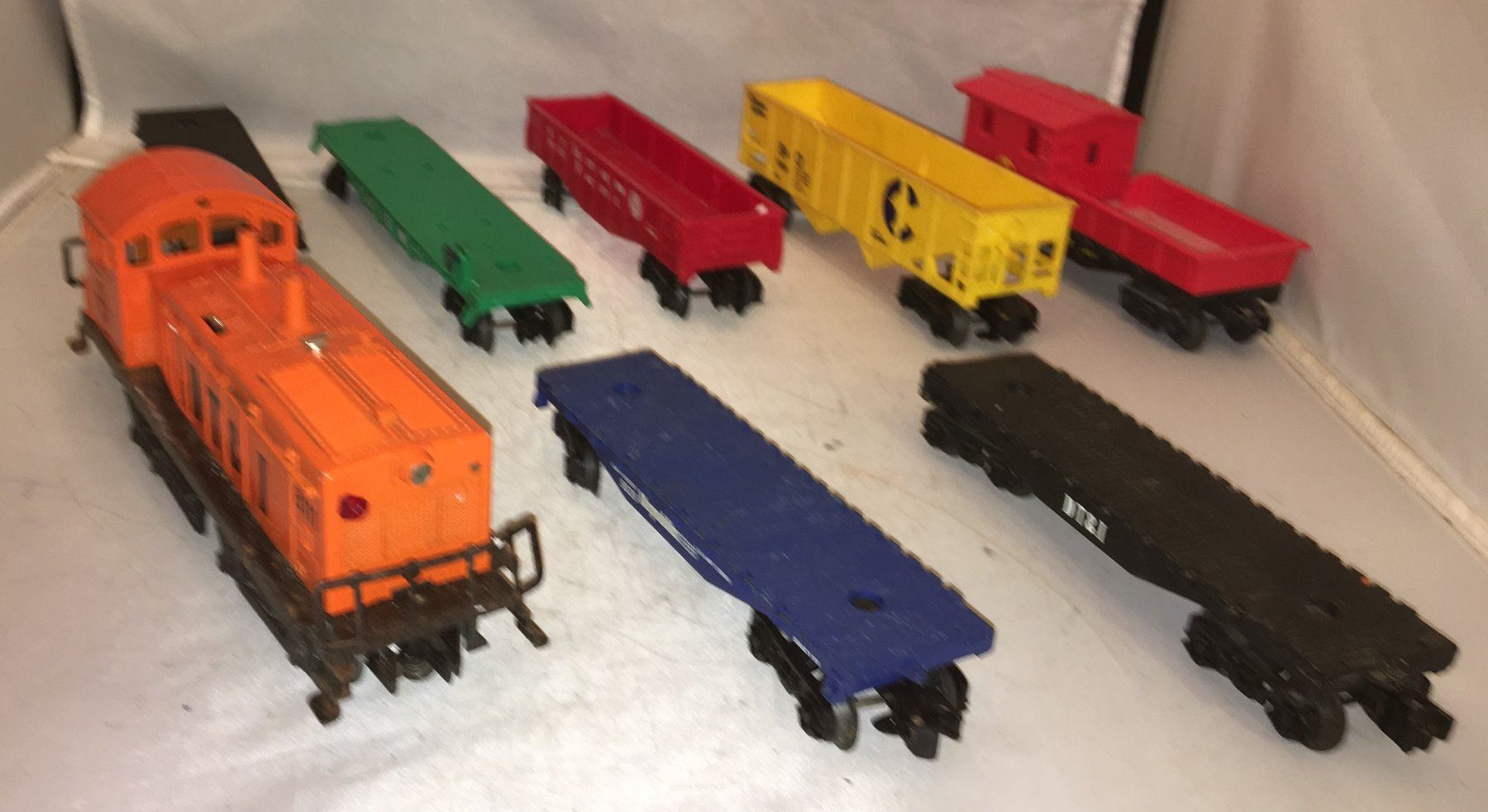 Lionel DTI O gauge diesel freight train. Powered DTI NW2 diesel engine (missing a marker light), two (2) DTI flat cars, a 9026 Republic flat car, a 9124 BLE flaat car, a 9032 Southern Pacific gondola car, a 9016 B&O hopper car, and a 9021 Santa Fe work caboose (loose cabin).