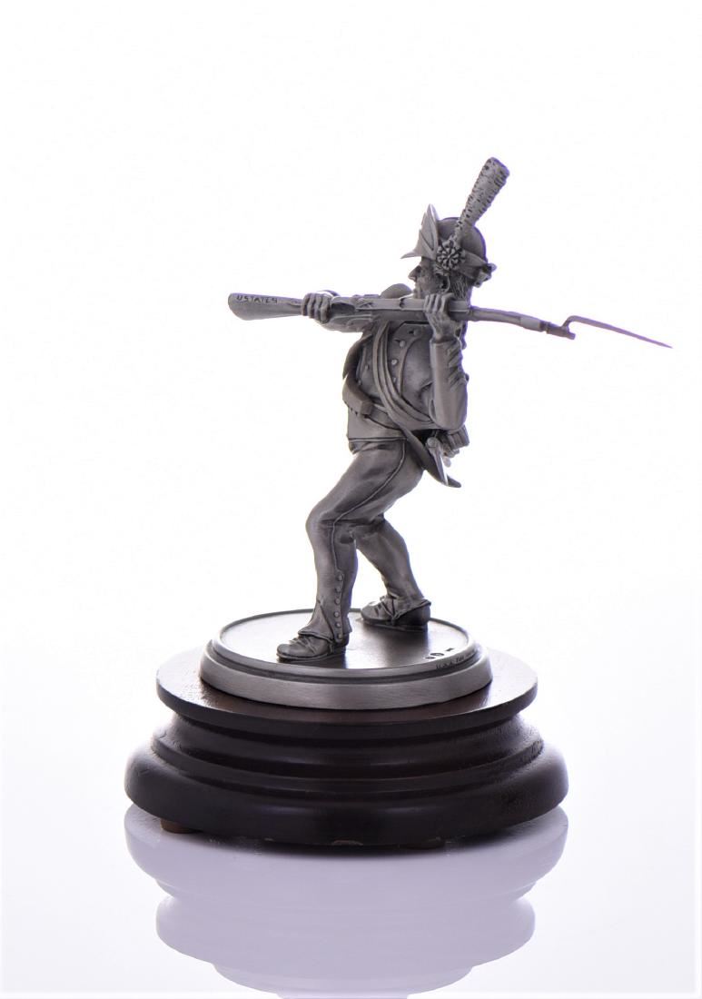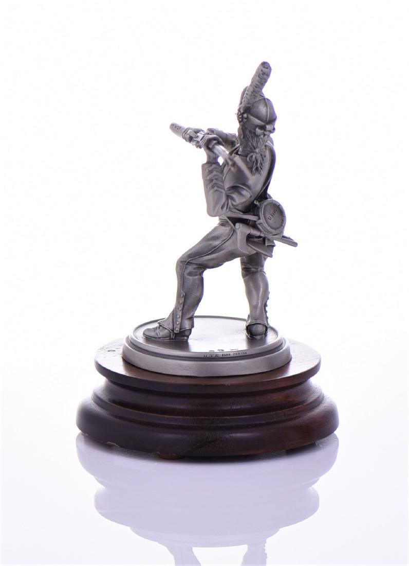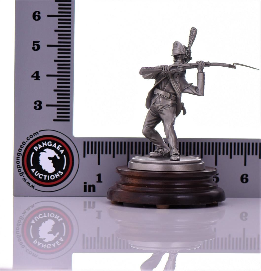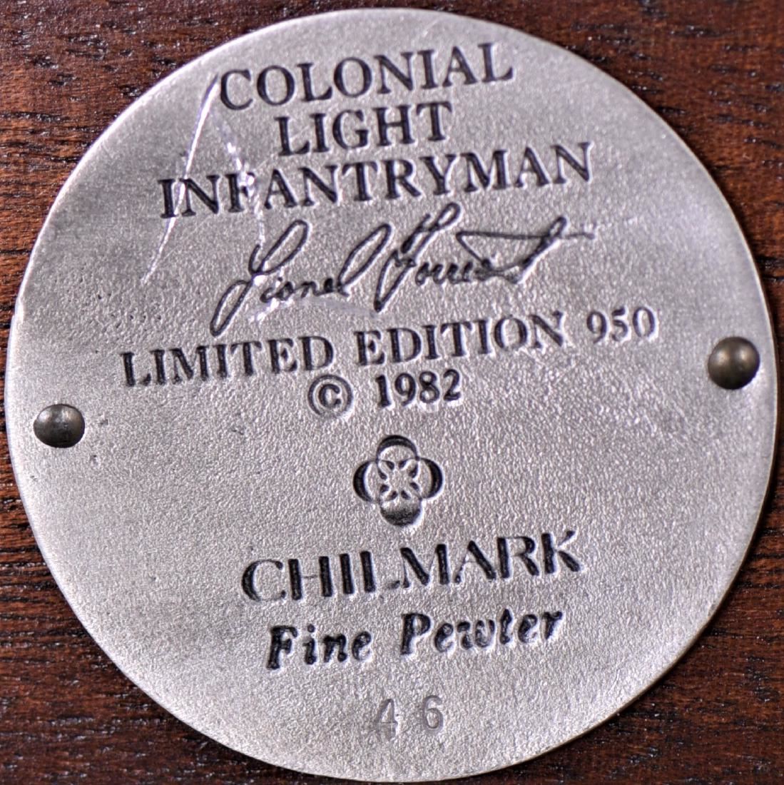 Lionel Forrest, 1982 Titled "Colonial Light Infantryman" 46 of 950. Chilmark's Fine Pewter On Wood Base Vietnam Art Sculpture. Estimated less than 50 yrs old. Pewter is a malleable metal alloy, traditionally 85 to 99 percent tin, with the remainder consisting of copper, antimony, bismuth and sometimes, less commonly today, lead. Silver is also sometimes used. Copper and antimony act as hardeners while lead is common in the lower grades of pewter, which have a bluish tint. It has a low melting point, around 338 to 446 deg F, depending on the exact mixture of metals. (Wikepedia) Size and/or Weight: See Measurement Photo. (Photos Represent The Lot Condition.)