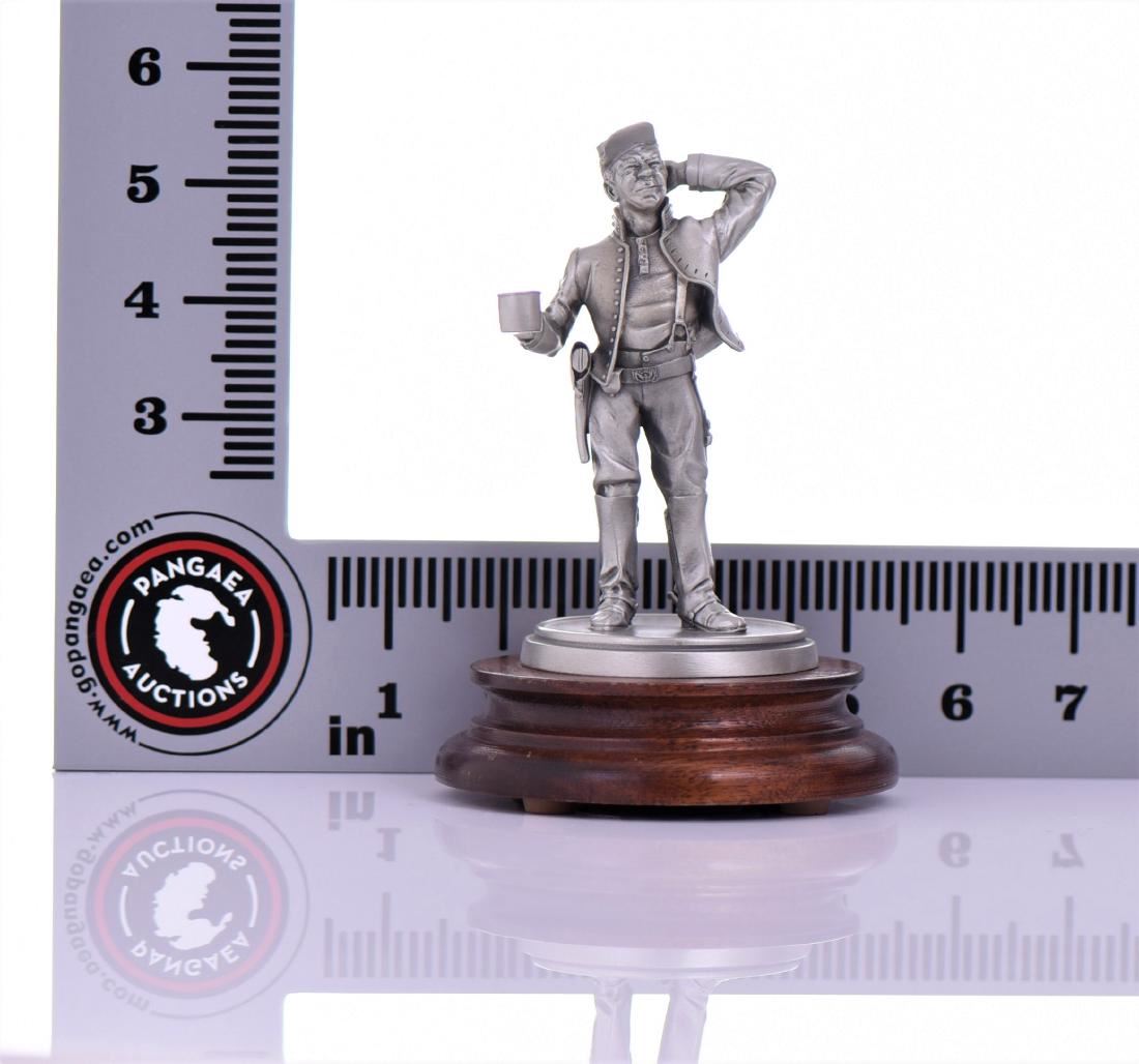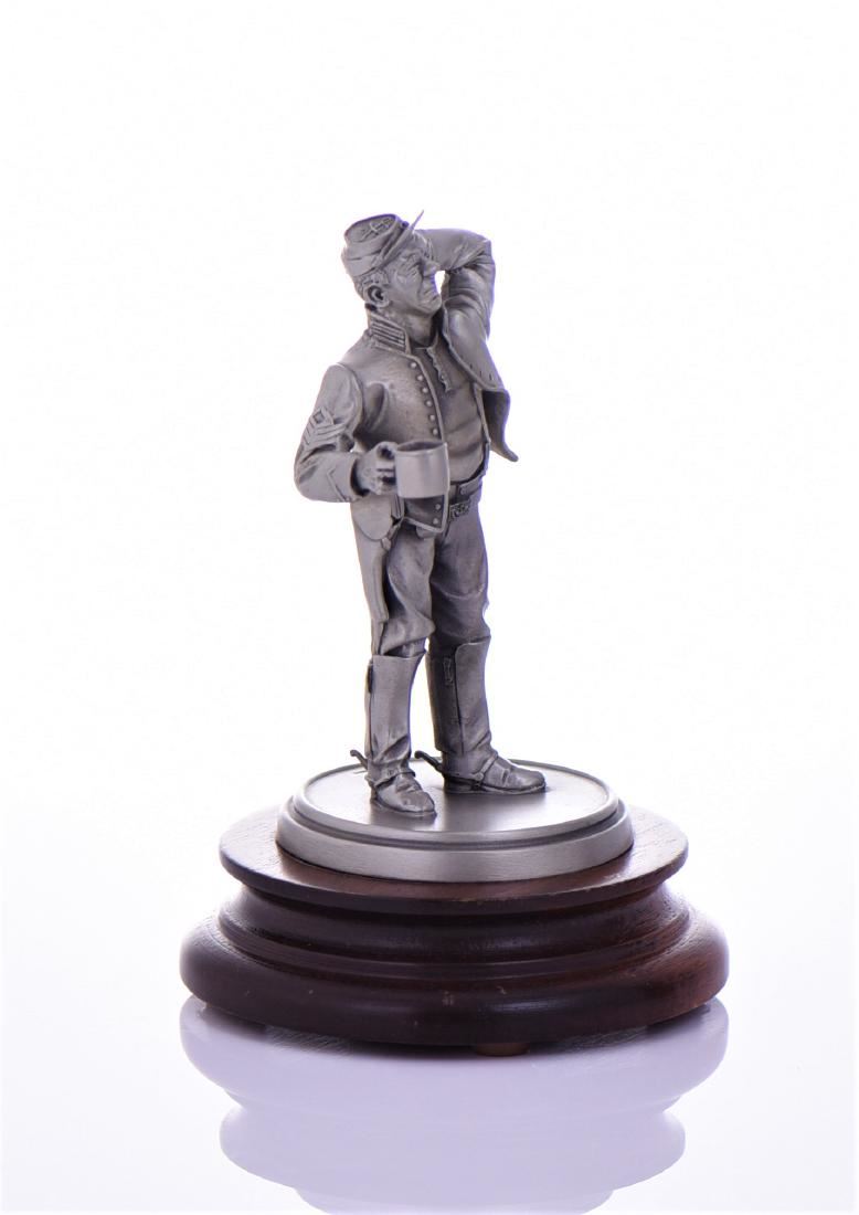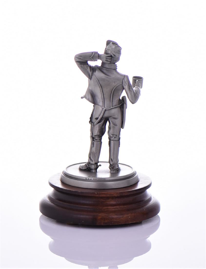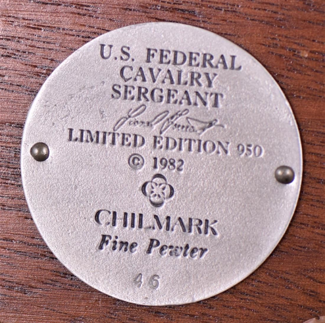 Lionel Forrest, 1982 Titled "U.S. Federal Cavalry Sergeant" 46 of 950. Chilmark's Fine Pewter On Wood Base Vietnam Art Sculpture. Estimated less than 50 yrs old. Pewter is a malleable metal alloy, traditionally 85 to 99 percent tin, with the remainder consisting of copper, antimony, bismuth and sometimes, less commonly today, lead. Silver is also sometimes used. Copper and antimony act as hardeners while lead is common in the lower grades of pewter, which have a bluish tint. It has a low melting point, around 338 to 446 deg F, depending on the exact mixture of metals. (Wikepedia) Size and/or Weight: See Measurement Photo. (Photos Represent The Lot Condition.)