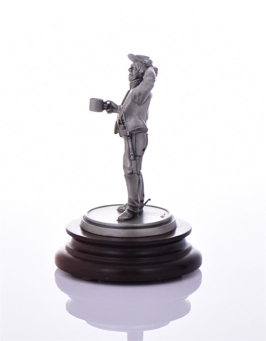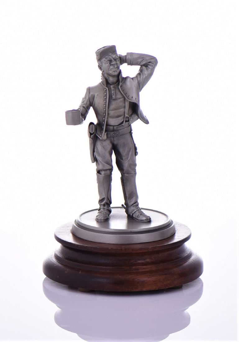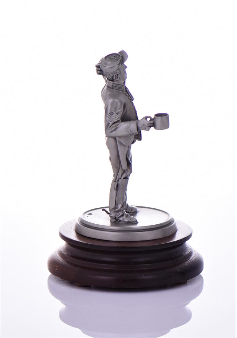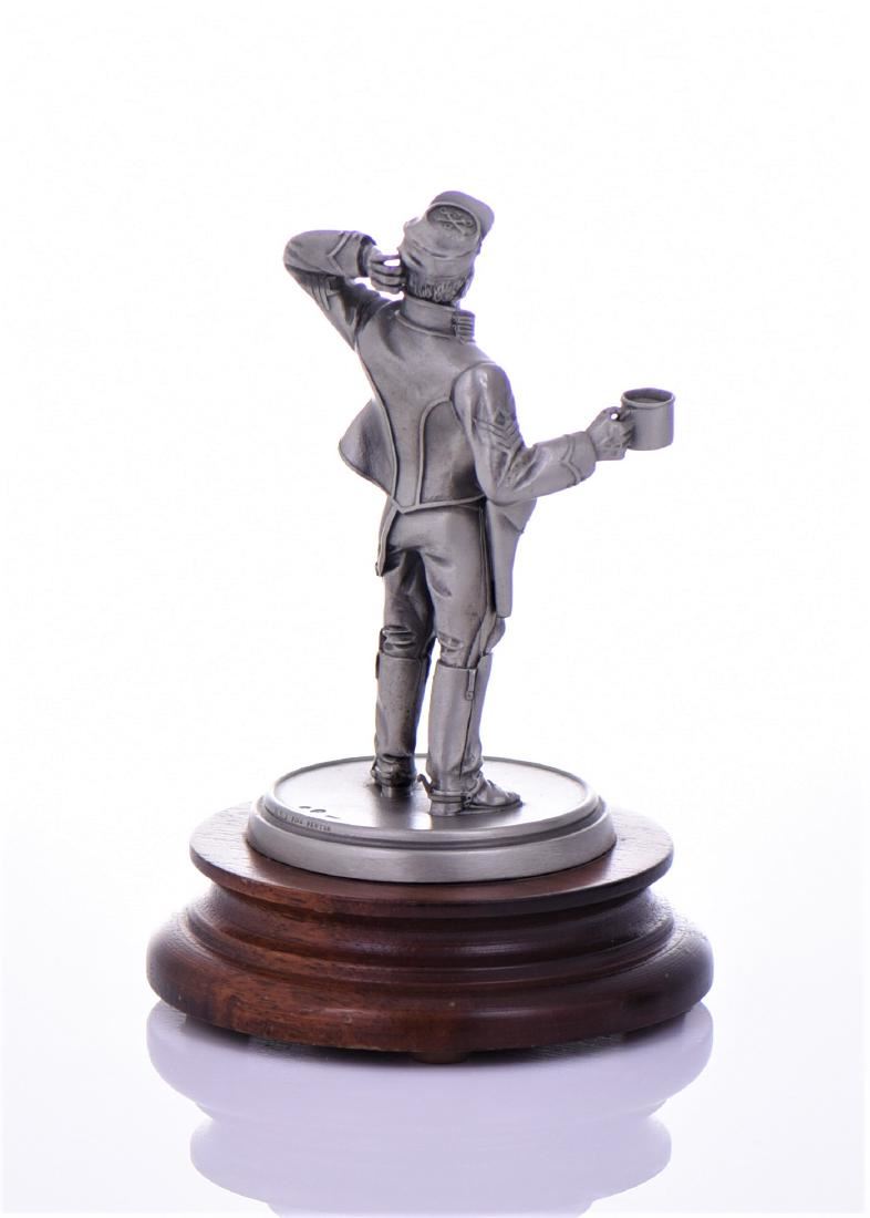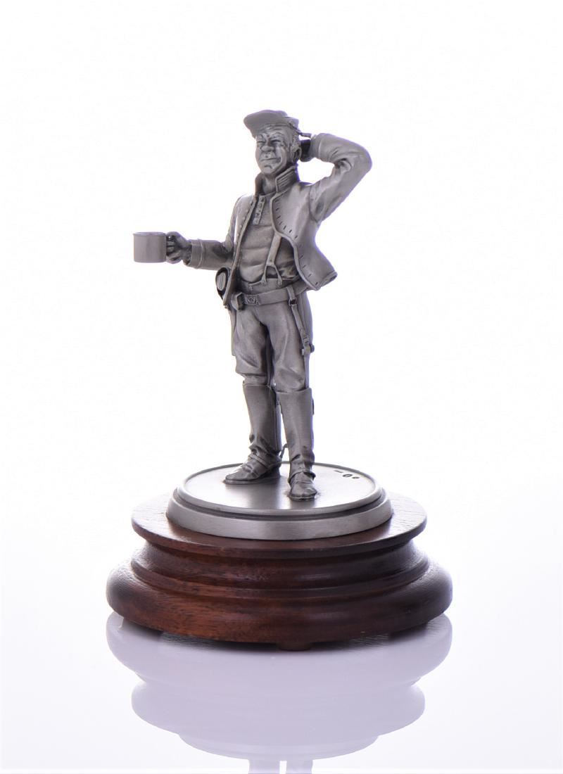 Lionel Forrest, 1982 Titled "U.S. Federal Cavalry Sergeant" 46 of 950. Chilmark's Fine Pewter On Wood Base Vietnam Art Sculpture. Estimated less than 50 yrs old. Pewter is a malleable metal alloy, traditionally 85 to 99 percent tin, with the remainder consisting of copper, antimony, bismuth and sometimes, less commonly today, lead. Silver is also sometimes used. Copper and antimony act as hardeners while lead is common in the lower grades of pewter, which have a bluish tint. It has a low melting point, around 338 to 446 deg F, depending on the exact mixture of metals. (Wikepedia) Size and/or Weight: See Measurement Photo. (Photos Represent The Lot Condition.)