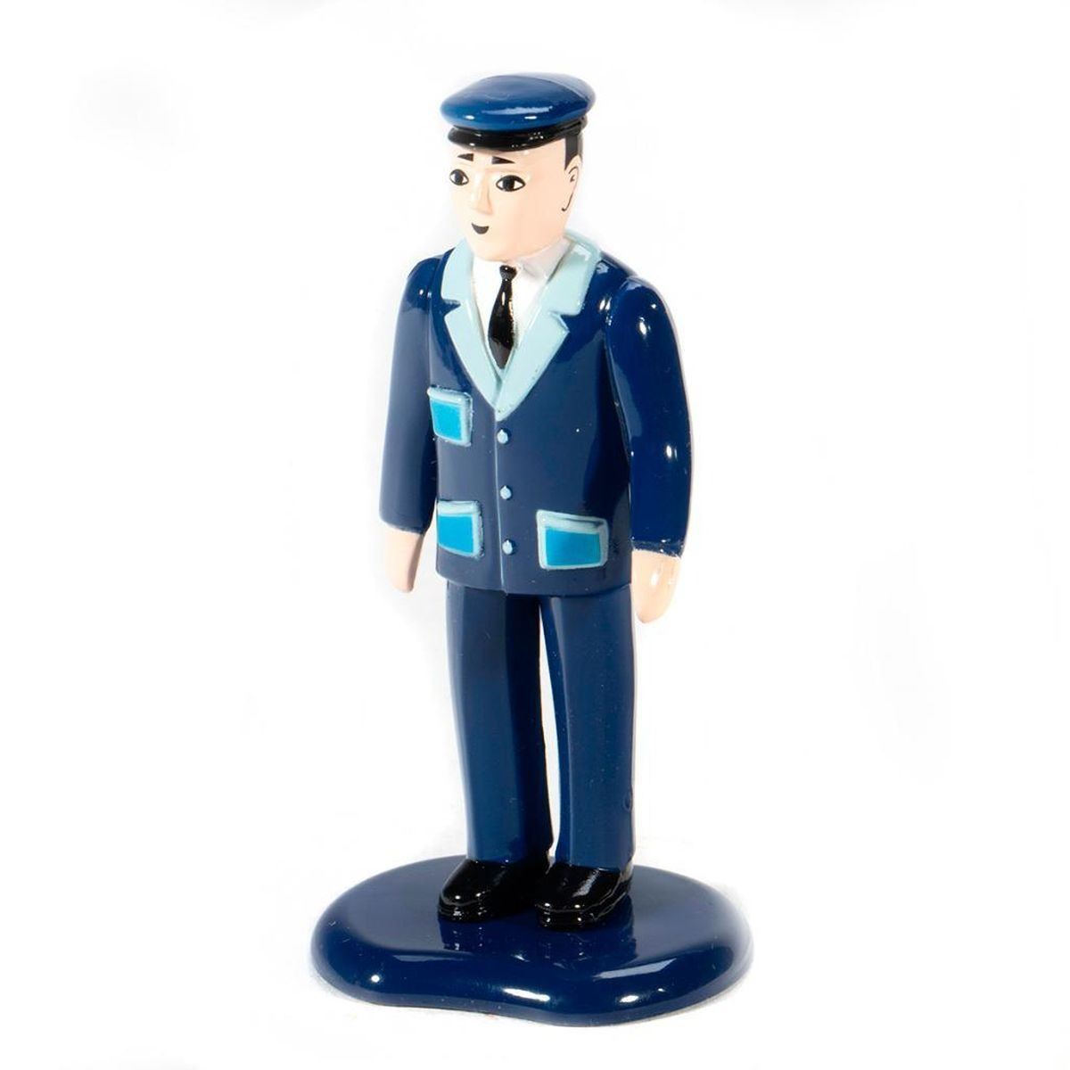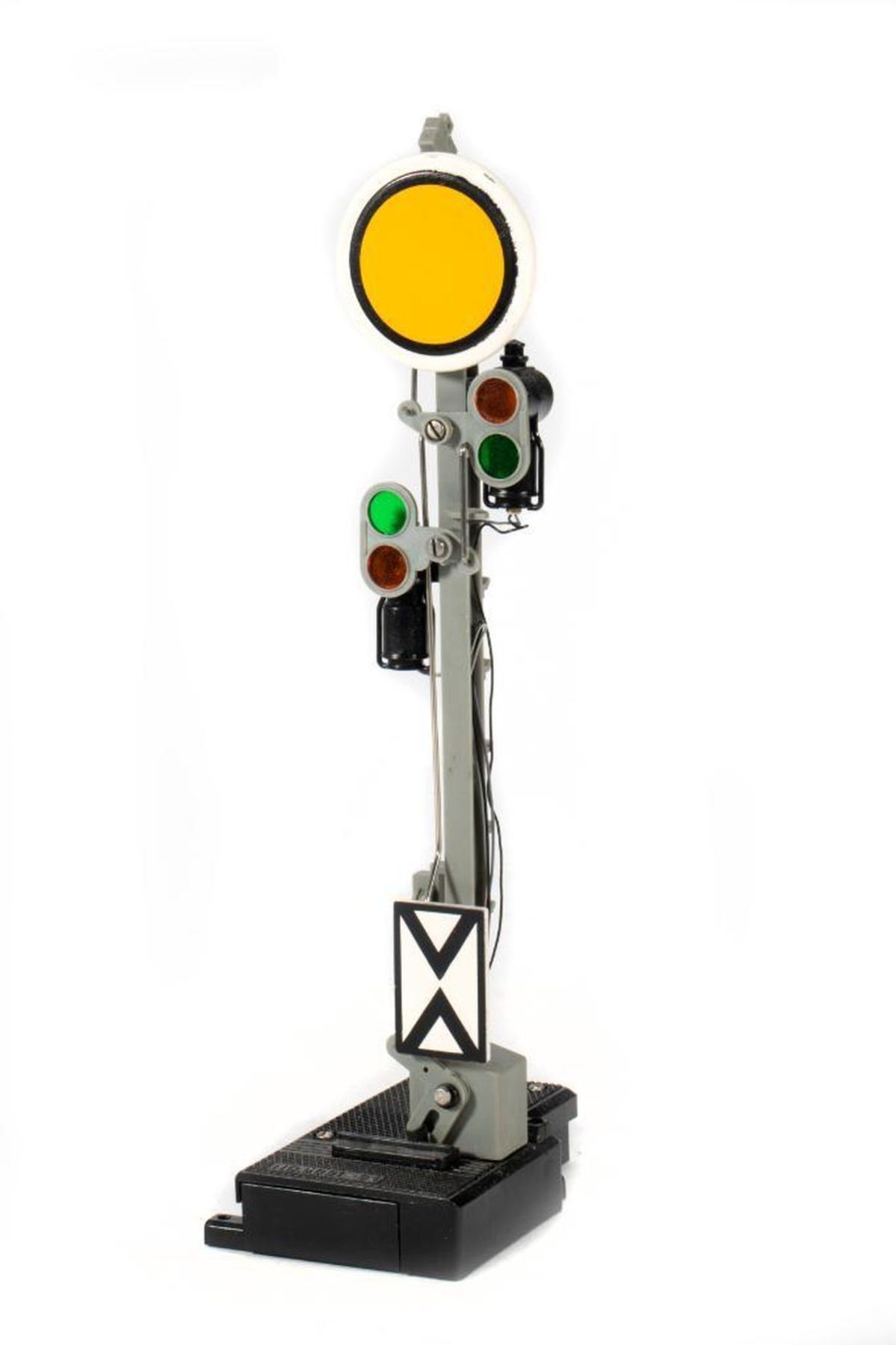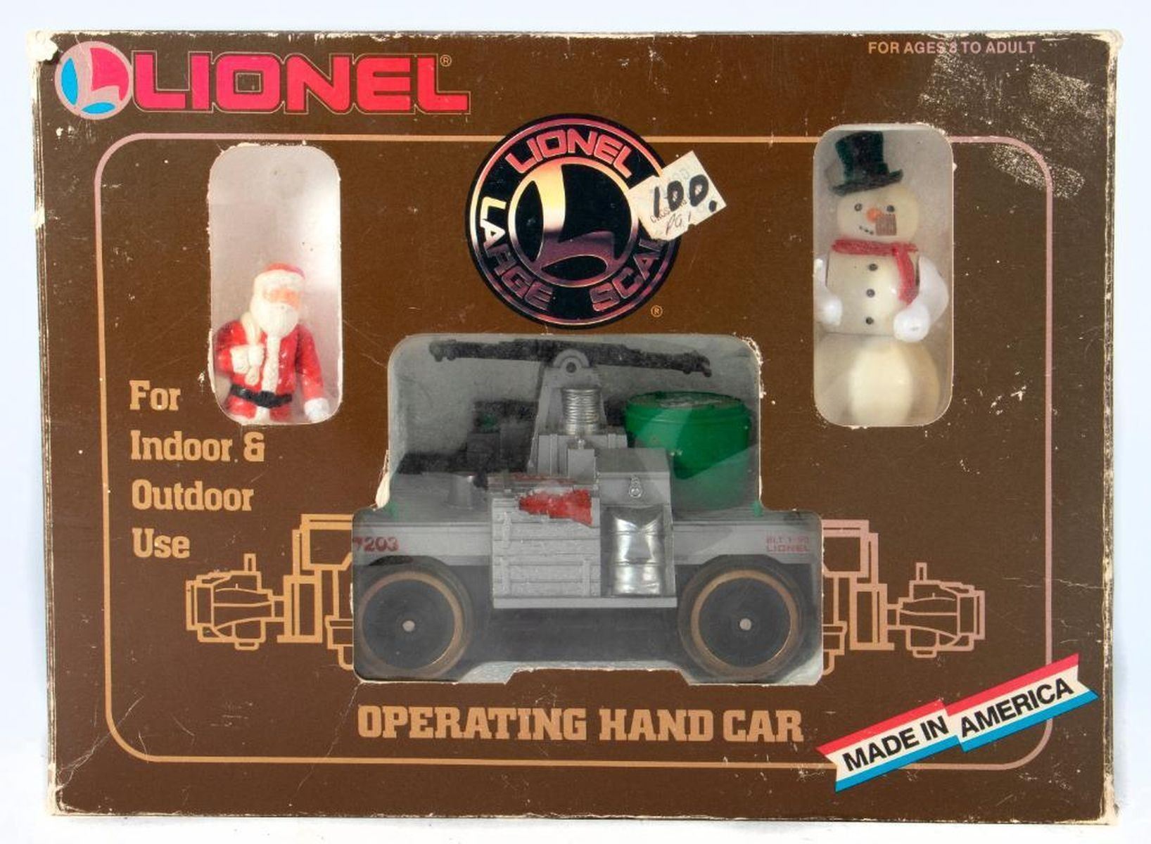 Hand car in box with santa and snowman figures. Semaphore and policeman figure